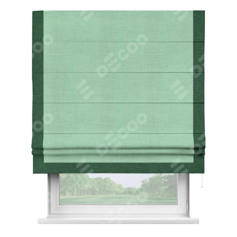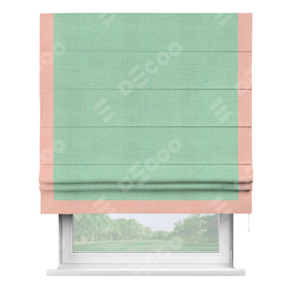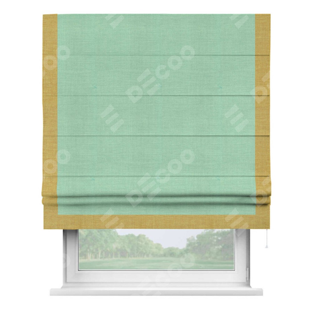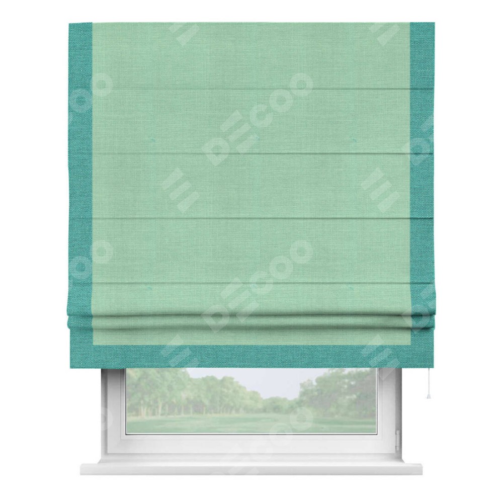 Римская штора производителя «Cortin», используется для проёма, пошита из ткани лён светло-бирюзовый, артикул 74737. Отделка шторы кантом «Виктория», ткань для канта используется из льна разной расцветки на выбор. Имеет универсальный механизм и подходит для монтажа: на потолок, на стену и в нишу.