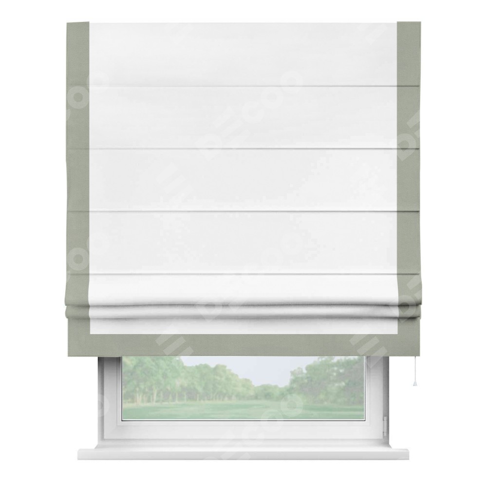 Римская штора производителя «Cortin», используется для проёма, пошита из ткани вельвет белоснежный, артикул ткани 19192. Отделка шторы кантом «Виктория», ткань для канта используется из вельвета разной расцветки на выбор. Имеет универсальный механизм и подходит для монтажа: на потолок, на стену и в нишу.