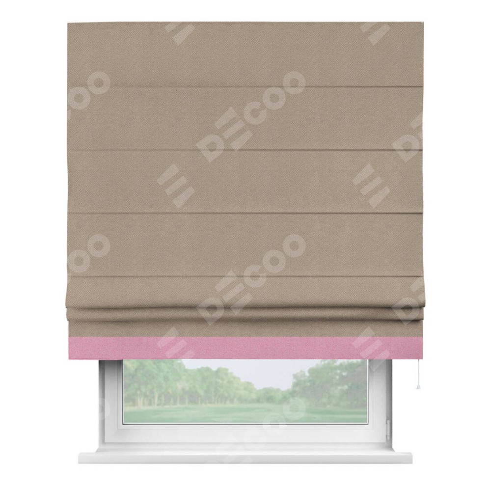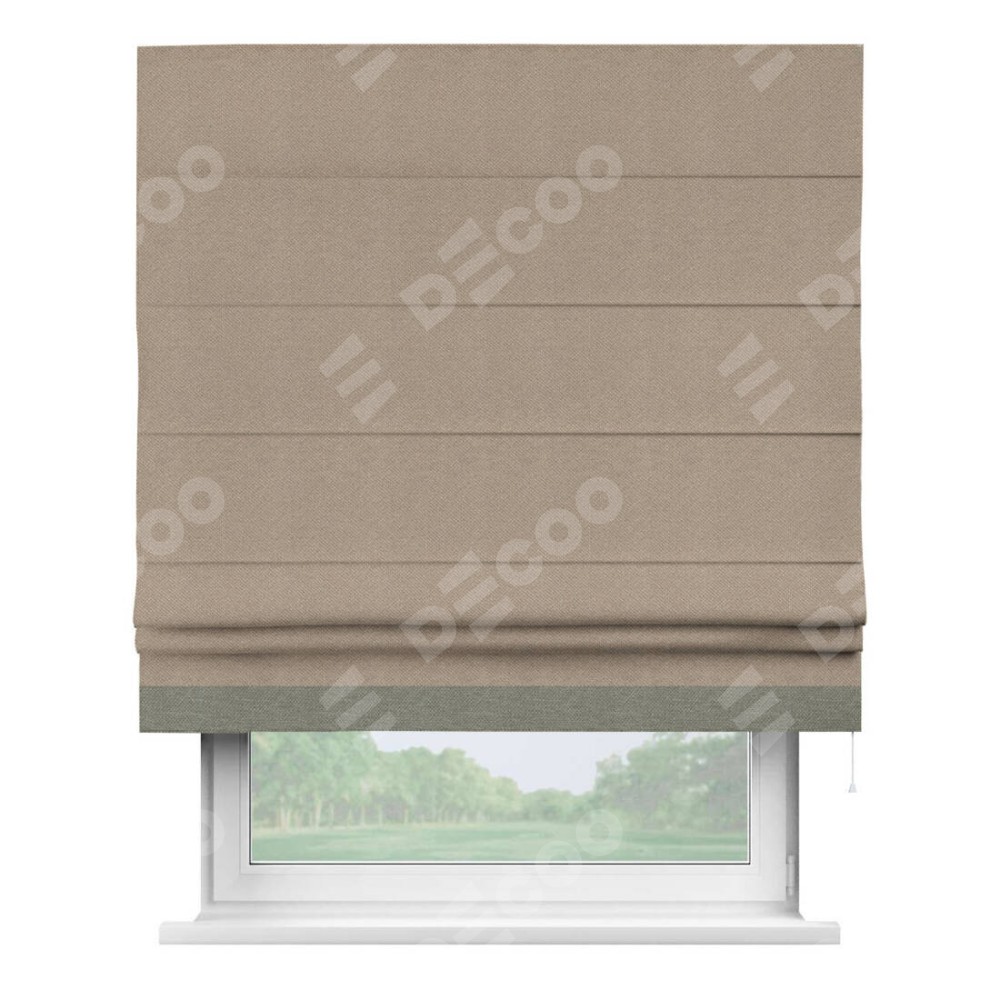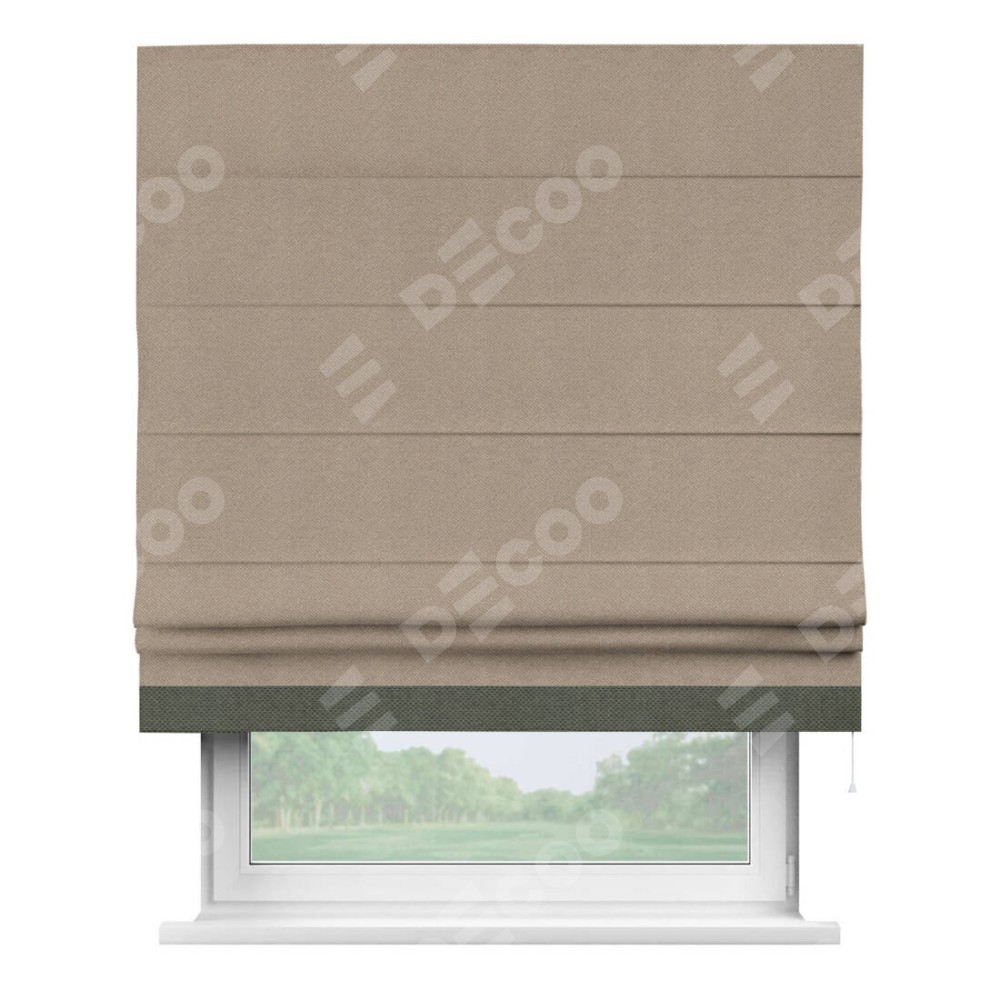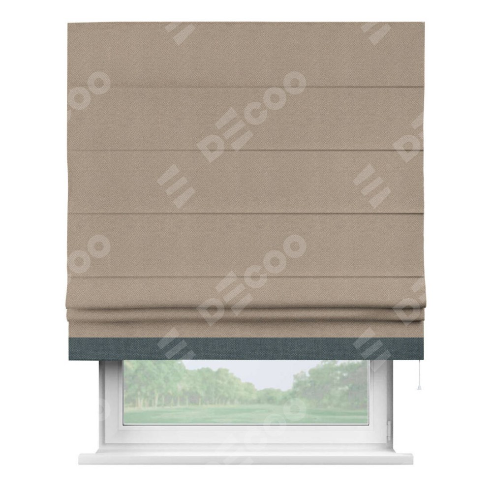 Римская штора производителя «Cortin», используется для проёма, пошита из ткани лён димаут светло-бежевый, артикул 00002. Отделка шторы кантом «Джестер», ткань для канта используется из льна димаут разной расцветки на выбор. Имеет универсальный механизм и подходит для монтажа: на потолок, на стену и в нишу.
