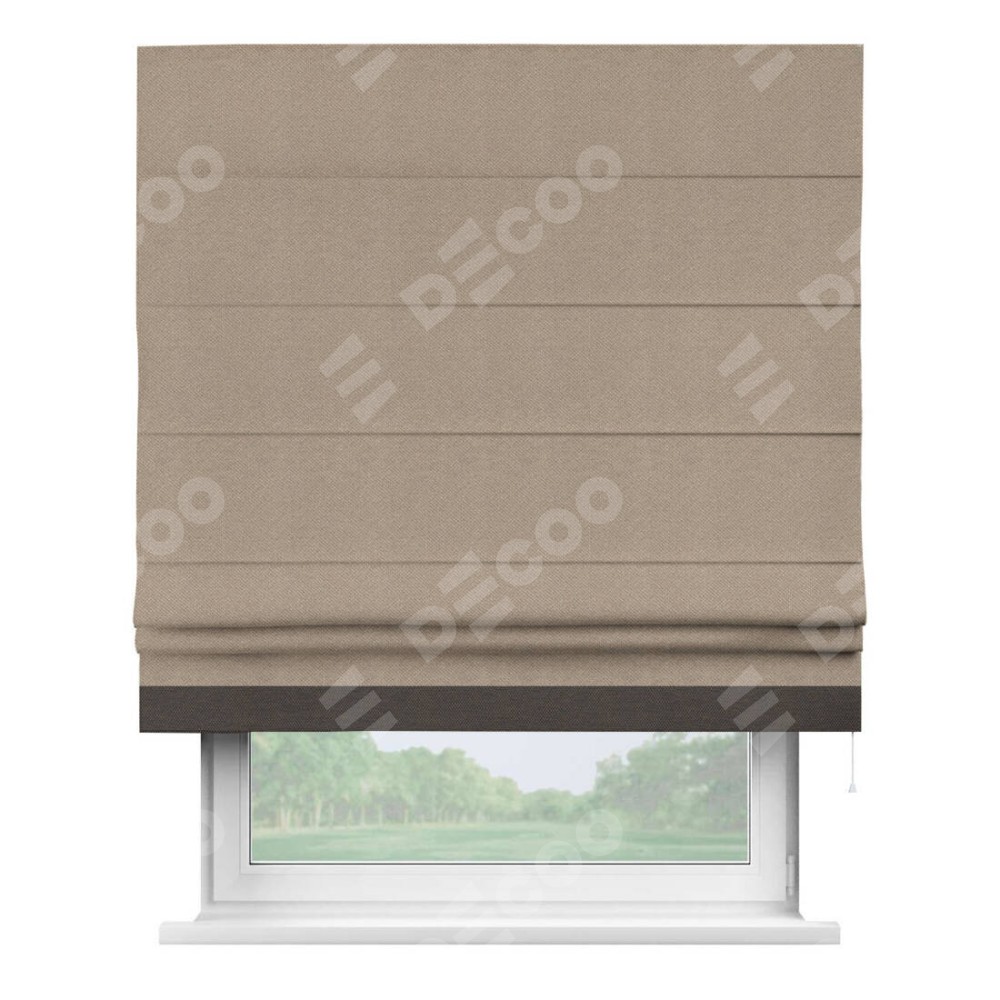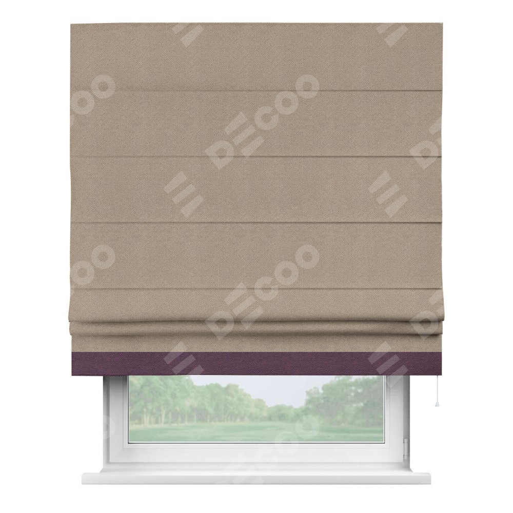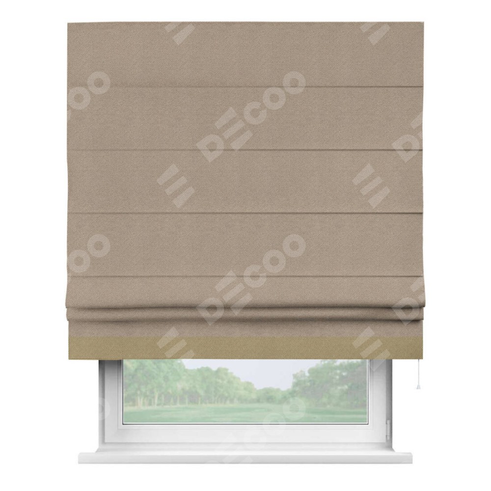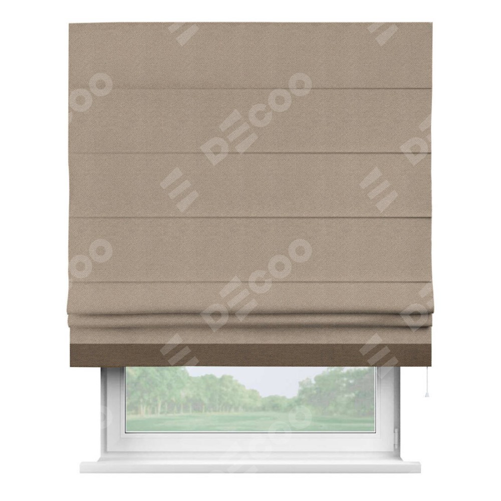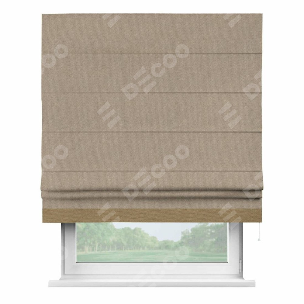 Римская штора производителя «Cortin», используется для проёма, пошита из ткани лён димаут светло-бежевый, артикул 00002. Отделка шторы кантом «Джестер», ткань для канта используется из льна димаут разной расцветки на выбор. Имеет универсальный механизм и подходит для монтажа: на потолок, на стену и в нишу.