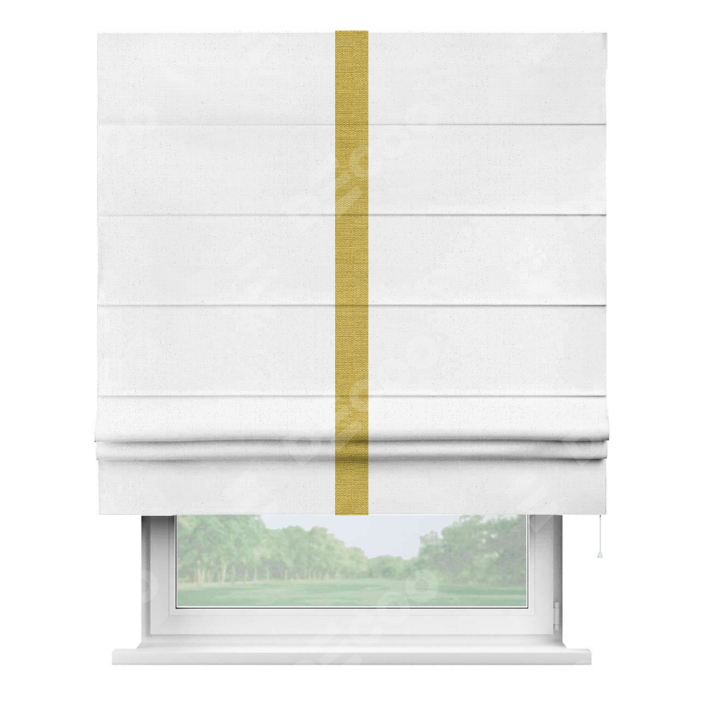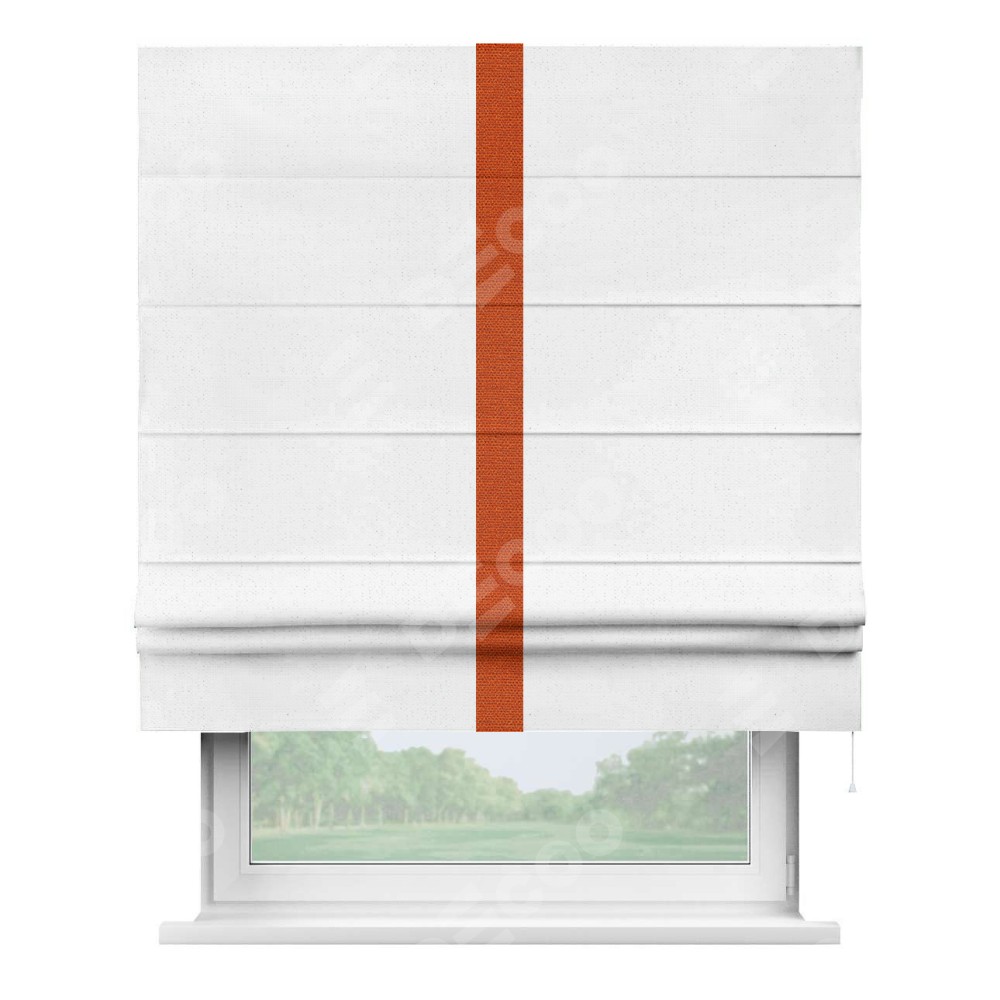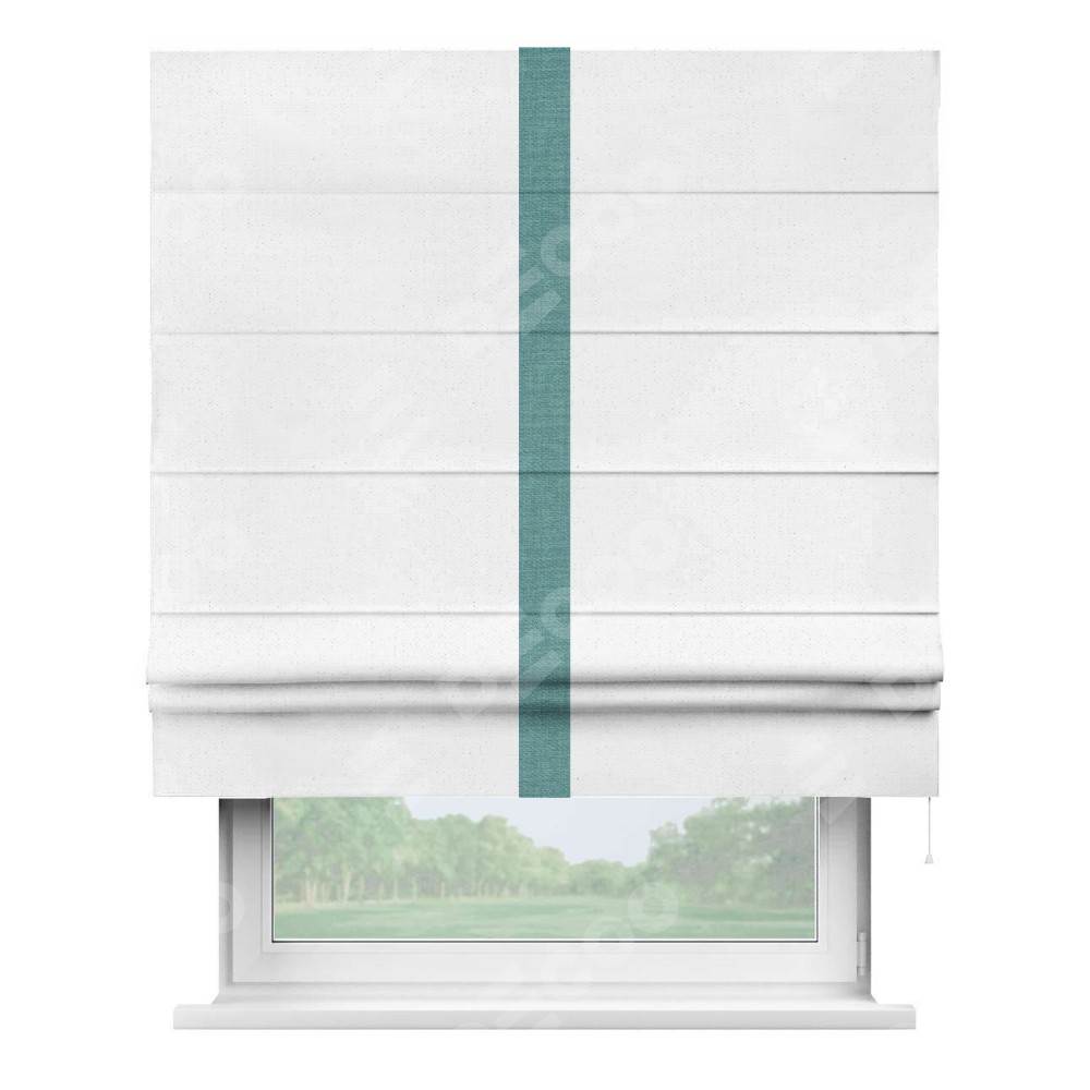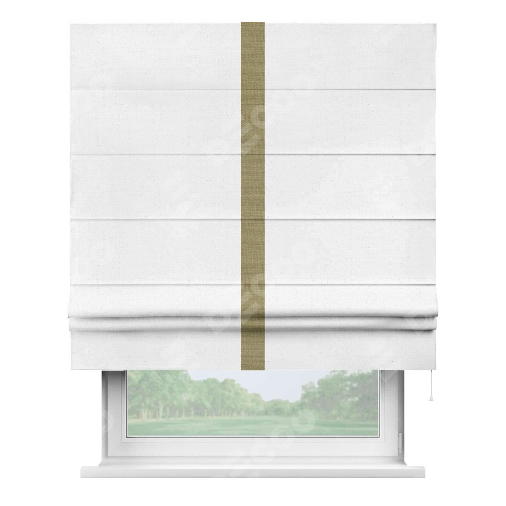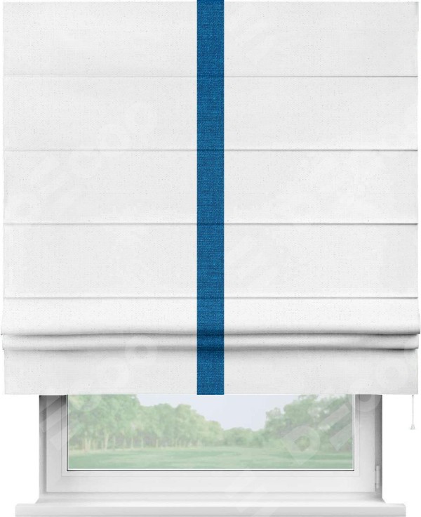 Римская штора производителя «Cortin», используется для проёма, пошита из ткани лён белый, артикул 7439. Отделка шторы кантом «Хайвэй», ткань для канта используется из льна разной расцветки на выбор. Имеет универсальный механизм и подходит для монтажа: на потолок, на стену и в нишу.