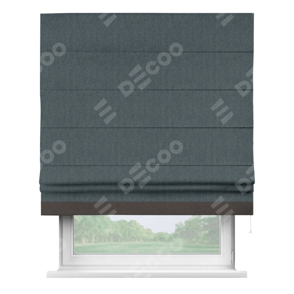Римская штора производителя «Cortin», используется для проёма, пошита из ткани лён димаут серо-синий, артикул 03238. Отделка шторы кантом «Джестер», ткань для канта используется из льна димаут разной расцветки на выбор. Имеет универсальный механизм и подходит для монтажа: на потолок, на стену и в нишу.