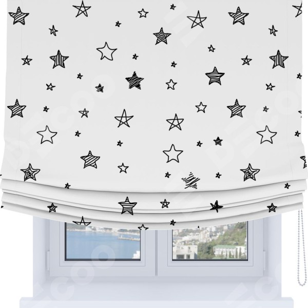 Римская штора Soft производителя «Cortin», используется для проёма, пошита из ткани блэкаут с нанесением сублимационной печати «Звёзды». Имеет универсальный механизм и подходит для монтажа: на потолок, на стену и в нишу. В отличие от стандартных римских штор, римская штора Soft не имеет горизонтальных вставок и нижнего отвеса. Это позволяет ткани произвольно драпироваться в свободные мягкие складки.