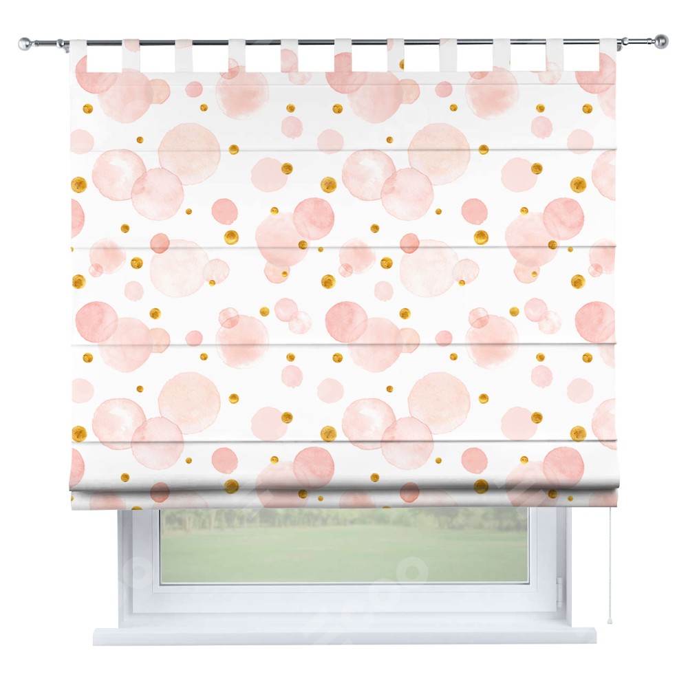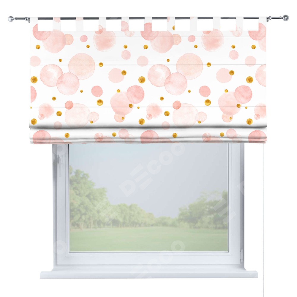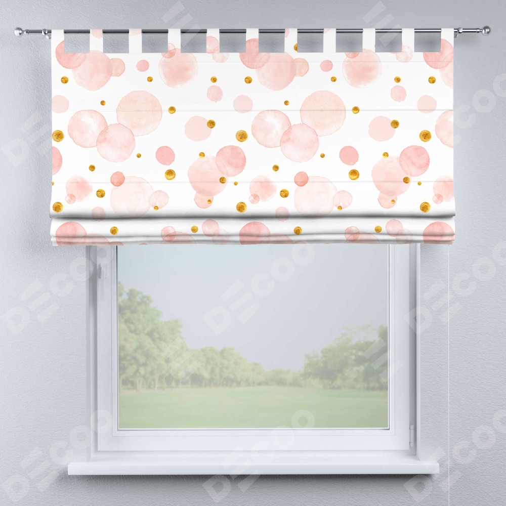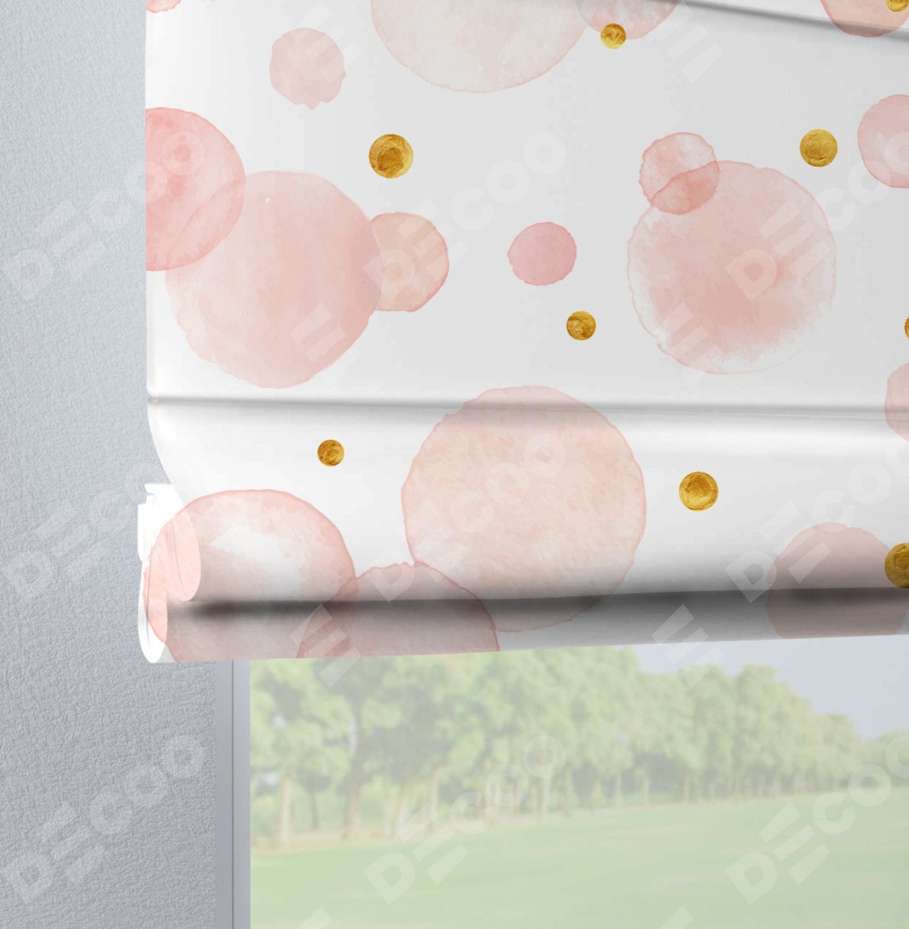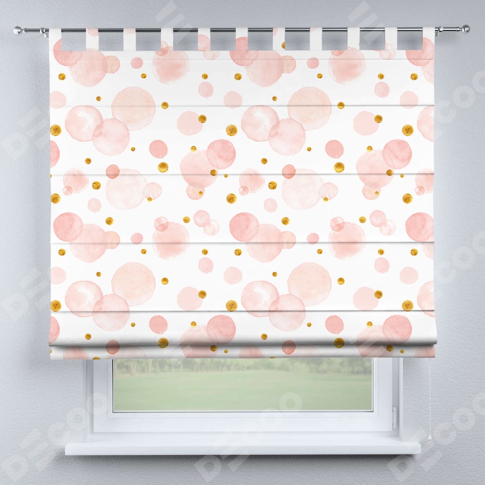 Римская штора производителя «Cortin», используется для проёма, пошита из ткани блэкаут с нанесением сублимационной печати «Круги и точки». Данная модель пошита на петлях, комплектуется на выбор круглым карнизом и подходит для монтажа на стену. Римская штора на петлях имеет простую систему регулировки высоты, отличительным преимуществом данной модели является простой способ монтажа. Достаточно повесить ее на трубу и штора готова!