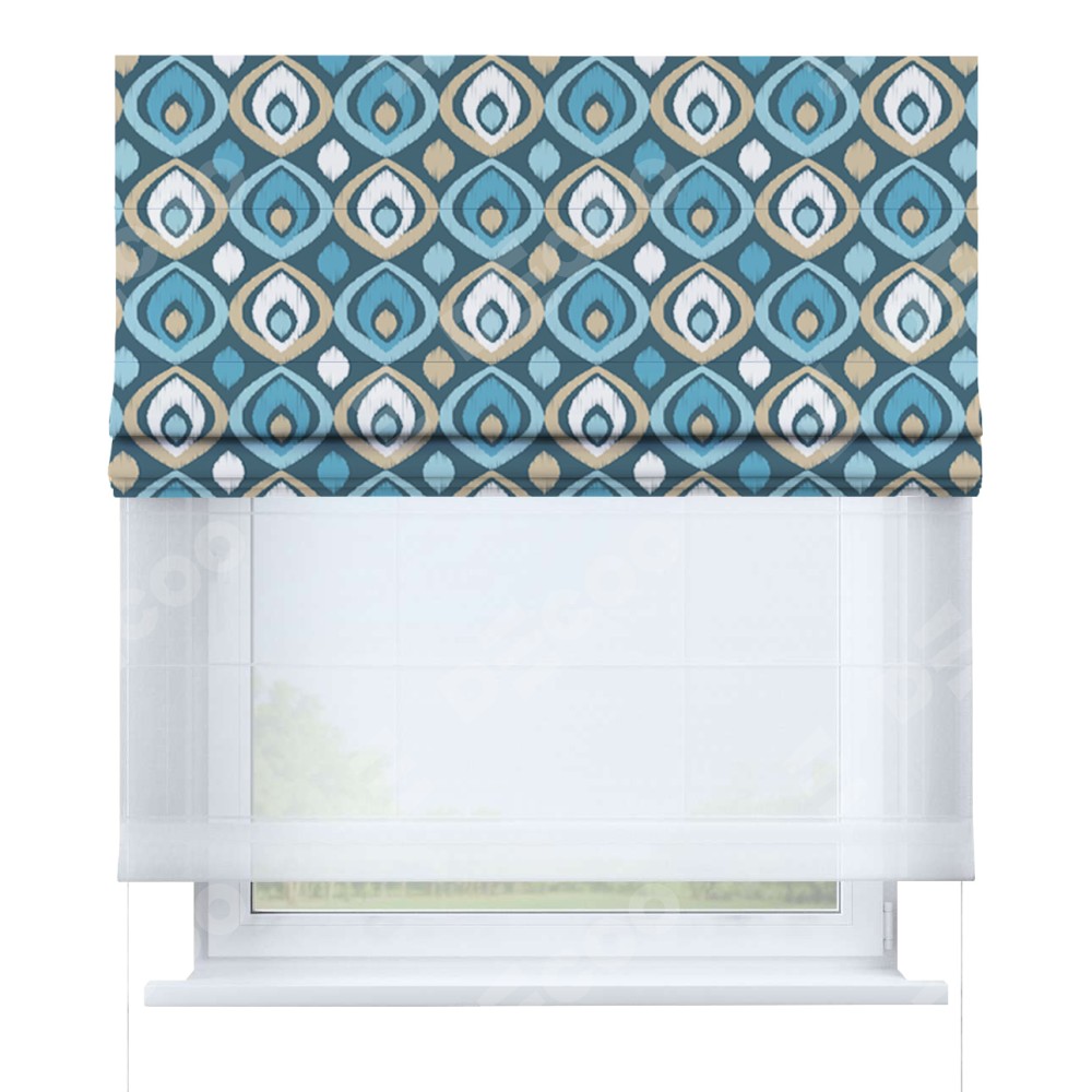 Римская штора день-ночь производителя «Cortin», используется для проёма, пошита из двух полотен, с лицевой блэкаут с нанесением сублимационной печати «Икат орнамент», вторая ткань тюль (по стандарту комплектуется тюль белого цвета артикул V-01). Имеет универсальный механизм и подходит для монтажа: на потолок, на стену и в нишу.