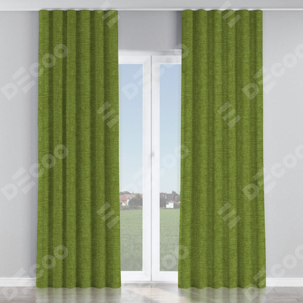 Комплект прямых штор, от производителя «Cortin», пошиты из ткани рогожка димаут салатовый, артикул ткани 80423. С изнаночной стороны в верхней части штор пристрачивается шторная лента с декоративными складками «Волна». Для создания элегантных складок прямые шторы шьются по стандарту с коэффициентом 1:2 (на 100 см. ширины проёма 200 см. ширины ткани).