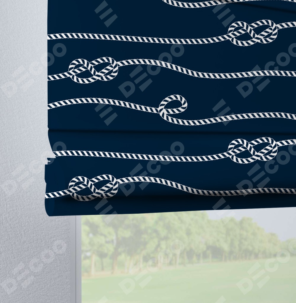Римская штора производителя «Cortin», используется для проёма, пошита из ткани блэкаут с нанесением сублимационной печати «Морской узел». Данная модель пошита на петлях, комплектуется на выбор круглым карнизом и подходит для монтажа на стену. Римская штора на петлях имеет простую систему регулировки высоты, отличительным преимуществом данной модели является простой способ монтажа. Достаточно повесить ее на трубу и штора готова!