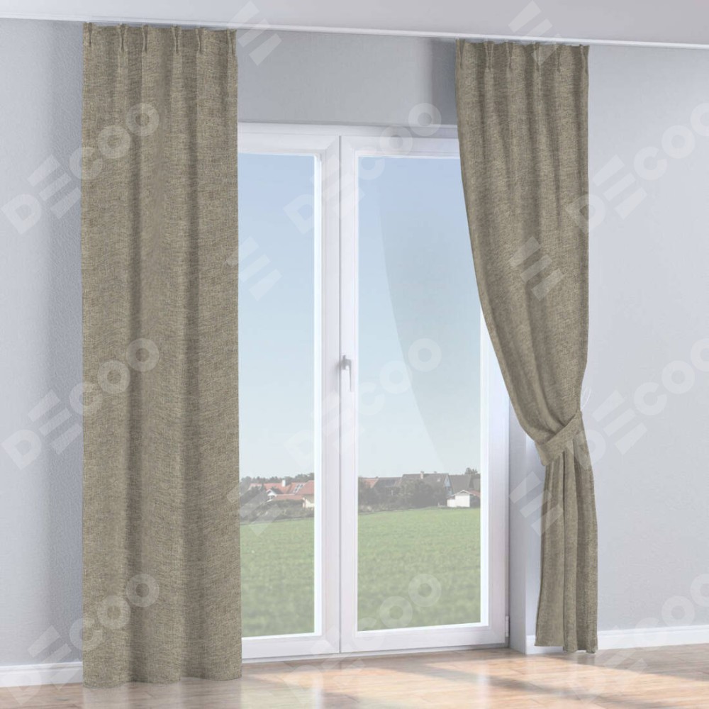 Комплект прямых штор, от производителя «Cortin», пошиты из ткани стиф димаут серо-коричневый, артикул ткани 44028. С изнаночной стороны в верхней части штор пристрачивается шторная лента с декоративными складками «Кустик». Для создания элегантных складок прямые шторы шьются по стандарту с коэффициентом 1:2 (на 100 см. ширины проёма 200 см. ширины ткани).