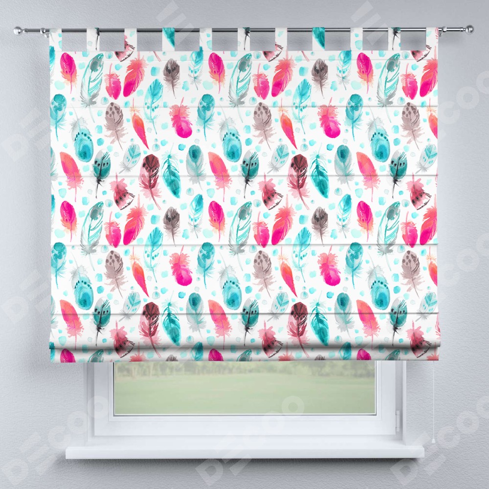 Римская штора производителя «Cortin», используется для проёма, пошита из ткани блэкаут с нанесением сублимационной печати «Перья». Данная модель пошита на петлях, комплектуется на выбор круглым карнизом и подходит для монтажа на стену. Римская штора на петлях имеет простую систему регулировки высоты, отличительным преимуществом данной модели является простой способ монтажа. Достаточно повесить ее на трубу и штора готова!