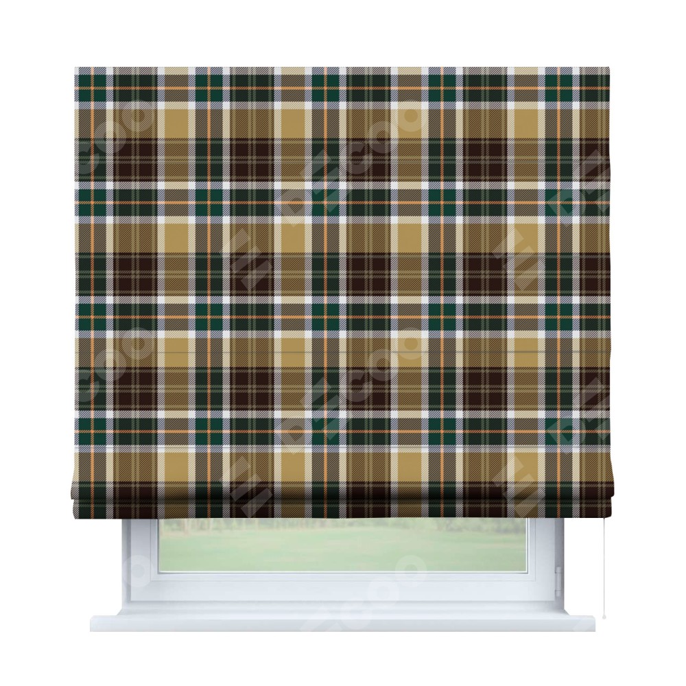 Римская штора производителя «Cortin», используется для проёма, пошита из ткани блэкаут с нанесением сублимационной печати «Бежево-зелёная клетка». Имеет универсальный механизм и подходит для монтажа: на потолок, на стену и в нишу.
