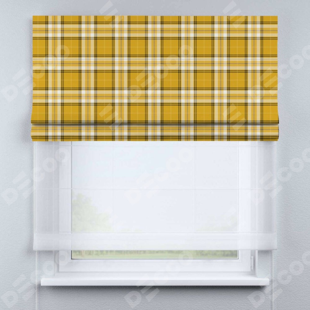 Римская штора день-ночь производителя «Cortin», используется для проёма, пошита из двух полотен, с лицевой блэкаут с нанесением сублимационной печати «Желто-горчичная клетка», вторая ткань тюль (по стандарту комплектуется тюль белого цвета артикул V-01). Имеет универсальный механизм и подходит для монтажа: на потолок, на стену и в нишу.