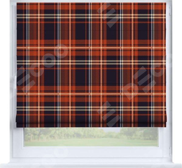 Римская штора производителя «Cortin», устанавливается на створку окна, пошита из ткани блэкаут с нанесением сублимационной печати «Сине-оранжевая клетка». Штора шьётся по индивидуальным размерам, для данного типа римской шторы возможная ширина от 35 до 150 см., высота до 250 см.