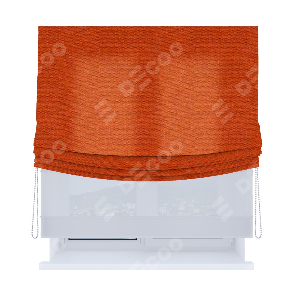 Римская штора день-ночь (двойная) от производителя «Cortin», используется для проёма. Пошита из двух полотен, основная ткань лён терракотовый артикул 53440, вторая ткань тюль (по стандарту используется тюль белого цвета артикул V-01). Имеет универсальный механизм и подходит для монтажа: на потолок, на стену и в нишу. Удобное управление каждой шторой отдельно.