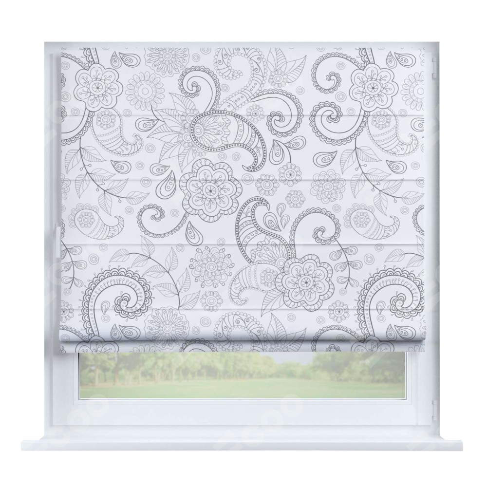 Римская штора производителя «Cortin», устанавливается на створку окна, пошита из ткани блэкаут с нанесением сублимационной печати «Изысканный пейсли». Штора шьётся по индивидуальным размерам, для данного типа римской шторы возможная ширина от 35 до 150 см., высота до 250 см.