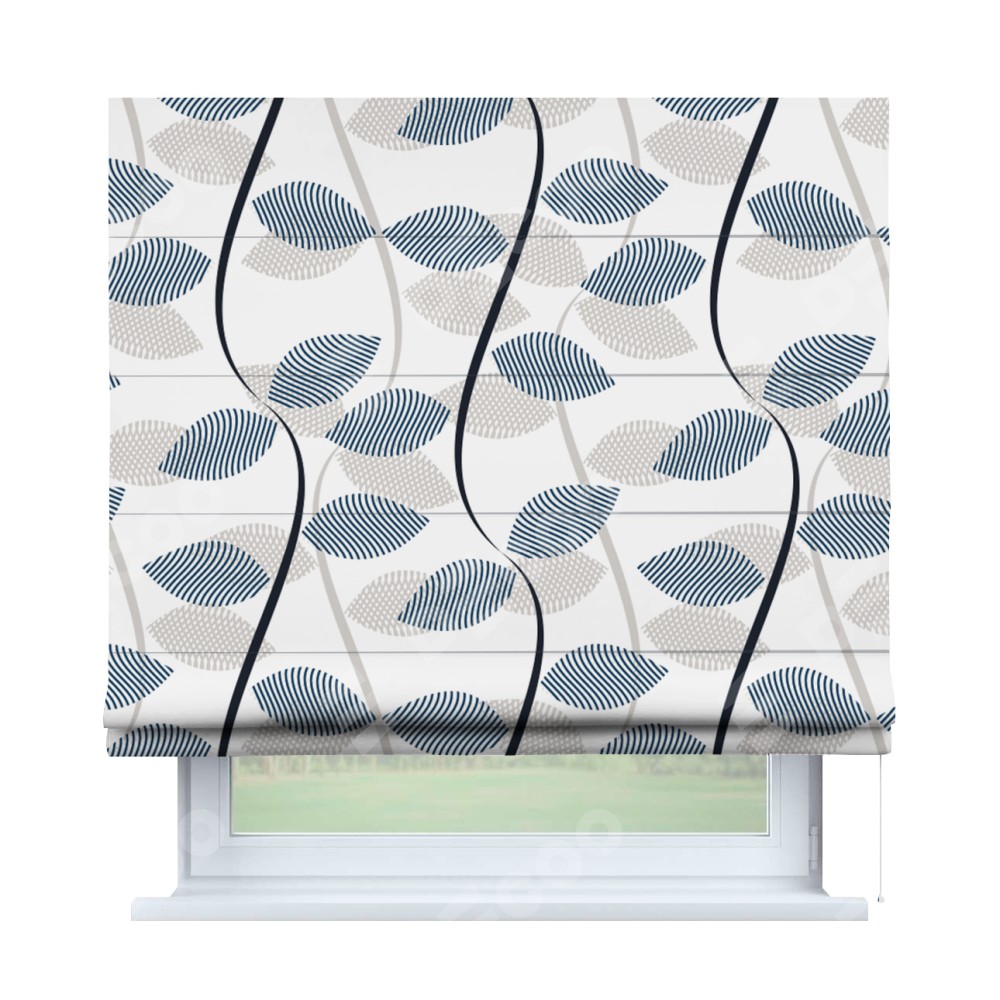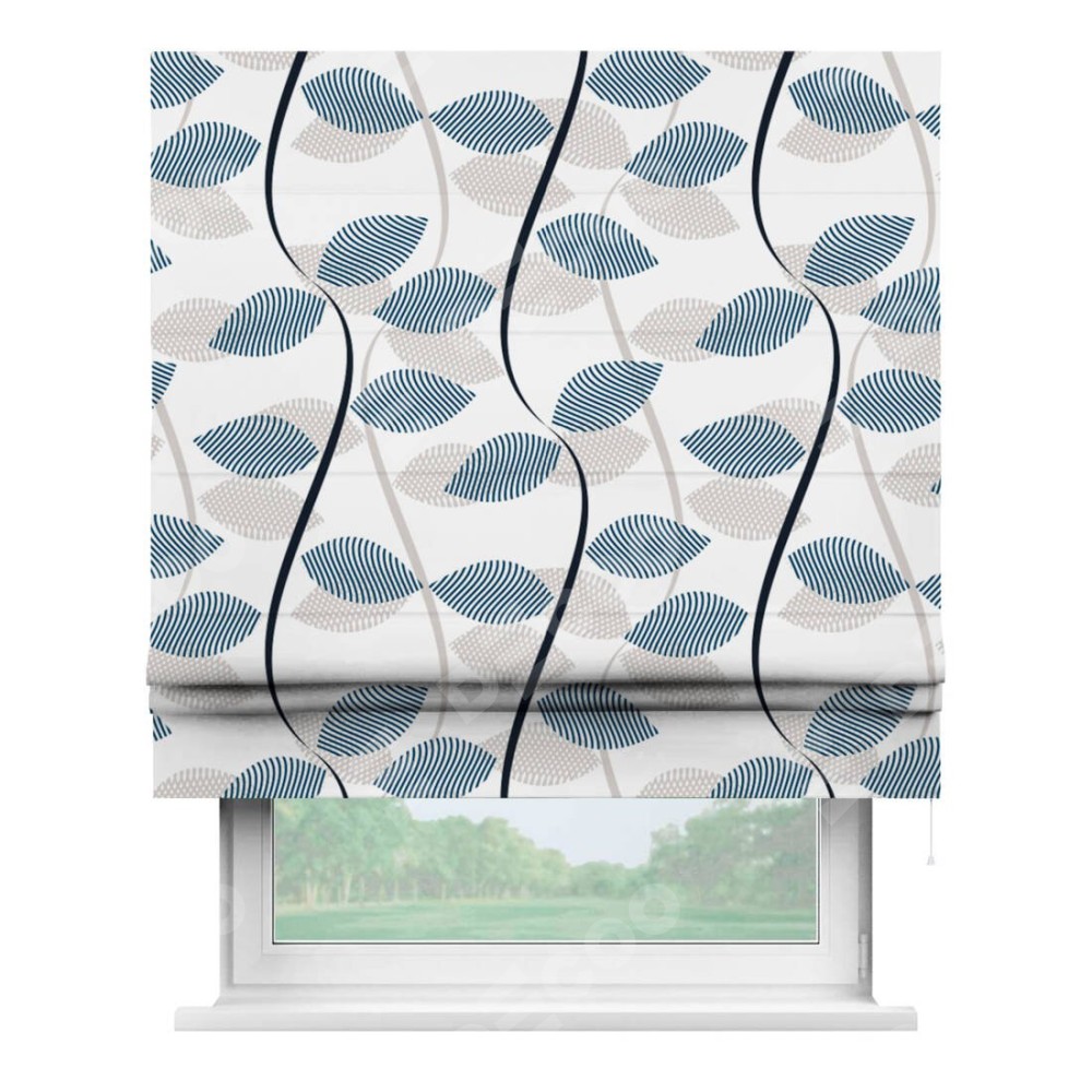 Римская штора производителя «Cortin», используется для проёма, пошита из ткани блэкаут с нанесением сублимационной печати «Резные листья». Имеет универсальный механизм и подходит для монтажа: на потолок, на стену и в нишу.