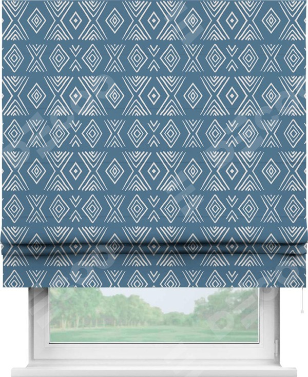 Римская штора производителя «Cortin», используется для проёма, пошита из ткани блэкаут с нанесением сублимационной печати «Графический орнамент». Имеет универсальный механизм и подходит для монтажа: на потолок, на стену и в нишу.