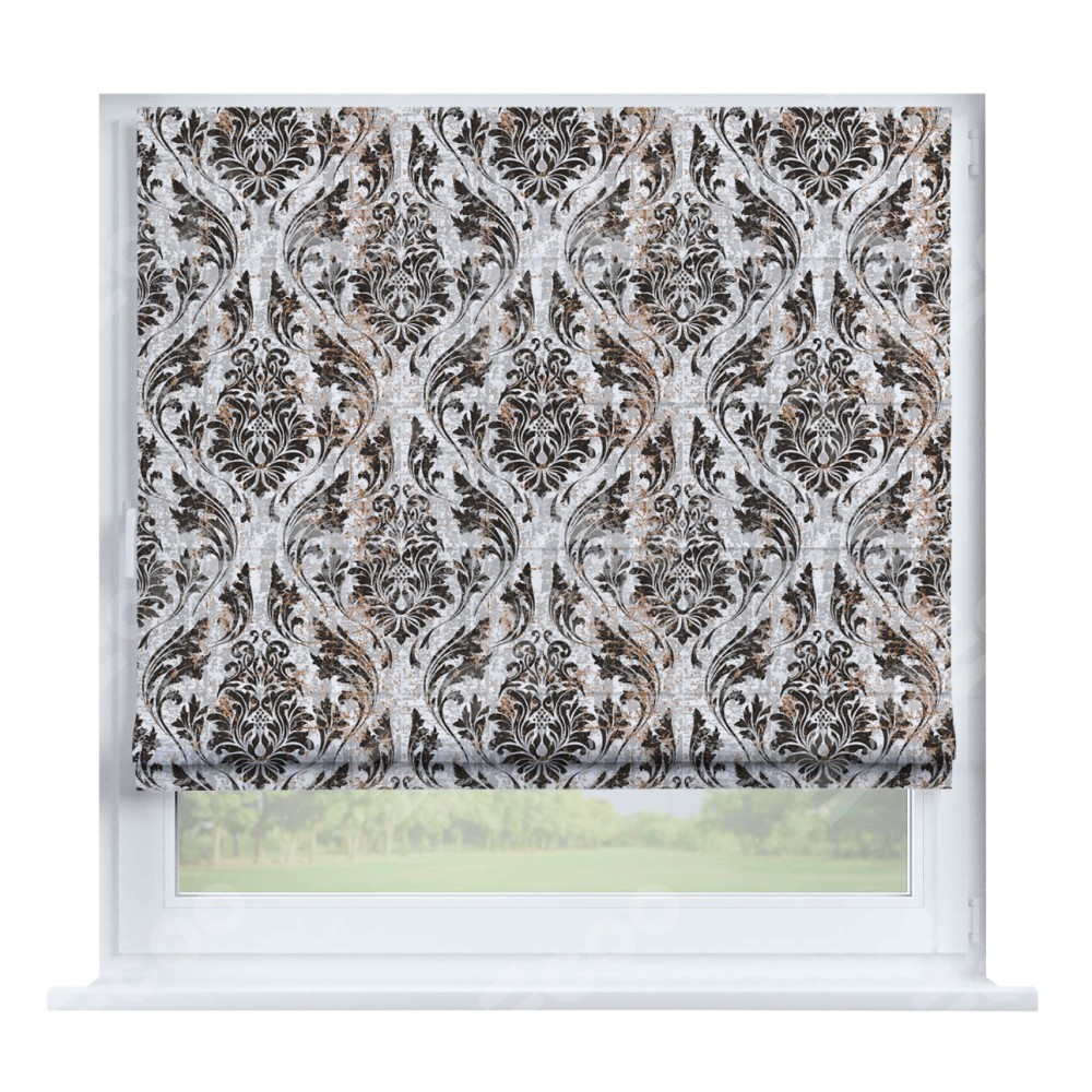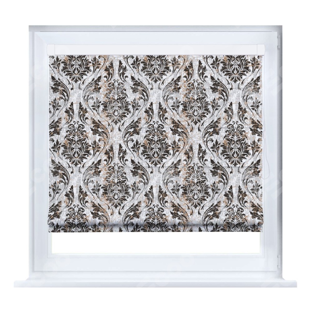 Римская штора производителя «Cortin», устанавливается на створку окна, пошита из ткани блэкаут с нанесением сублимационной печати «Дамаск тёмный». Штора шьётся по индивидуальным размерам, для данного типа римской шторы возможная ширина от 35 до 150 см., высота до 250 см.