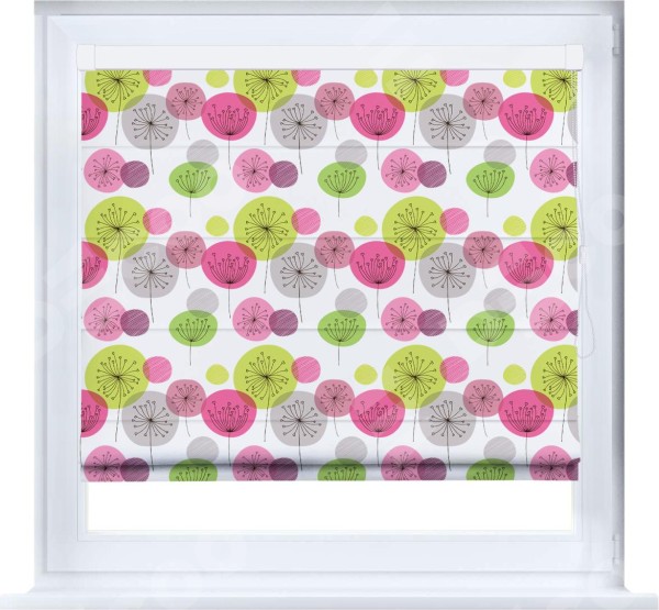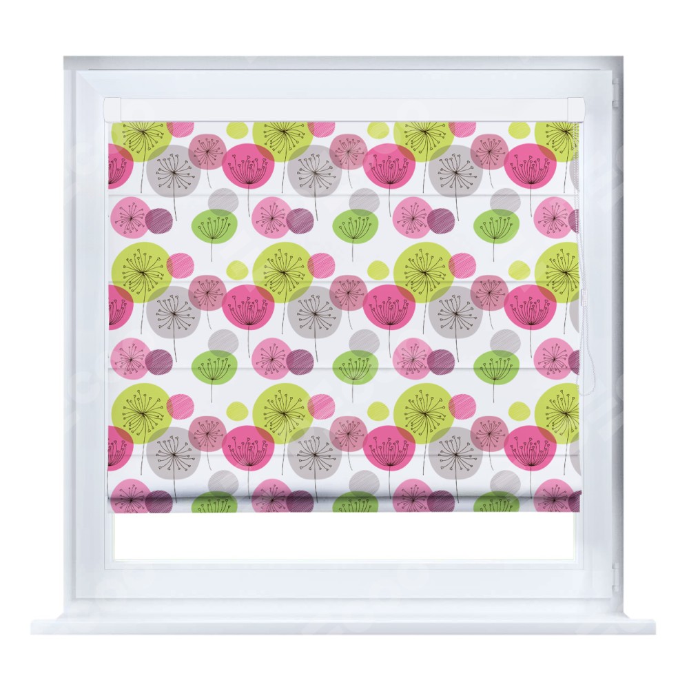 Римская штора производителя «Cortin», устанавливается на створку окна, пошита из ткани блэкаут с нанесением сублимационной печати «Цветные одуванчики». Штора шьётся по индивидуальным размерам, для данного типа римской шторы возможная ширина от 35 до 150 см., высота до 250 см.