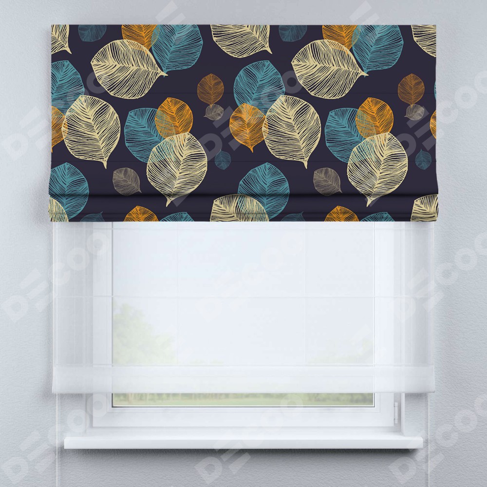 Римская штора день-ночь производителя «Cortin», используется для проёма, пошита из двух полотен, с лицевой блэкаут с нанесением сублимационной печати «Листья в ночи», вторая ткань тюль (по стандарту комплектуется тюль белого цвета артикул V-01). Имеет универсальный механизм и подходит для монтажа: на потолок, на стену и в нишу.