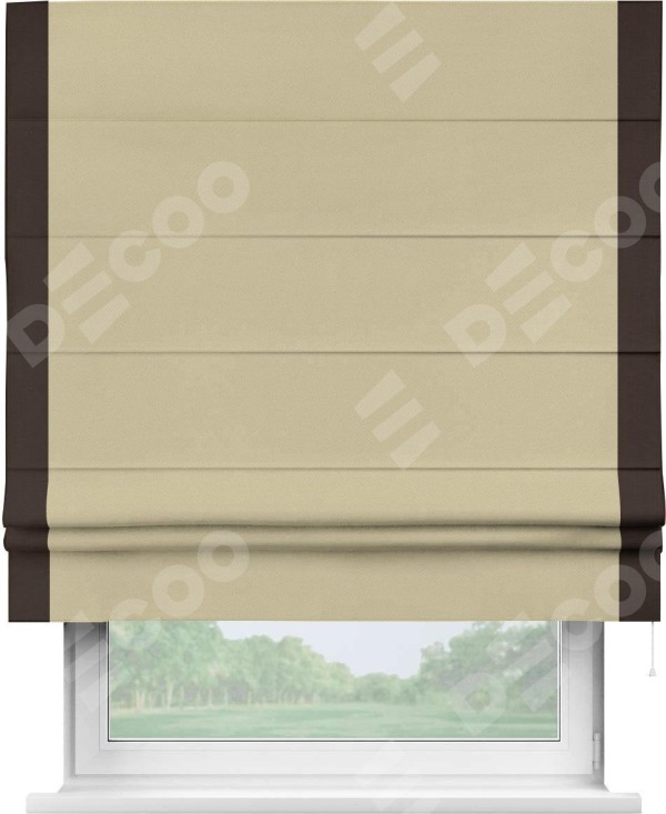 Римская штора производителя «Cortin», используется для проёма, пошита из ткани блэкаут однотонный кофейный, артикул ткани 13130. Отделка шторы кантом «Стрим Дуо», ткань для канта используется из блэкаута однотонного разной расцветки на выбор. Имеет универсальный механизм и подходит для монтажа: на потолок, на стену и в нишу.
