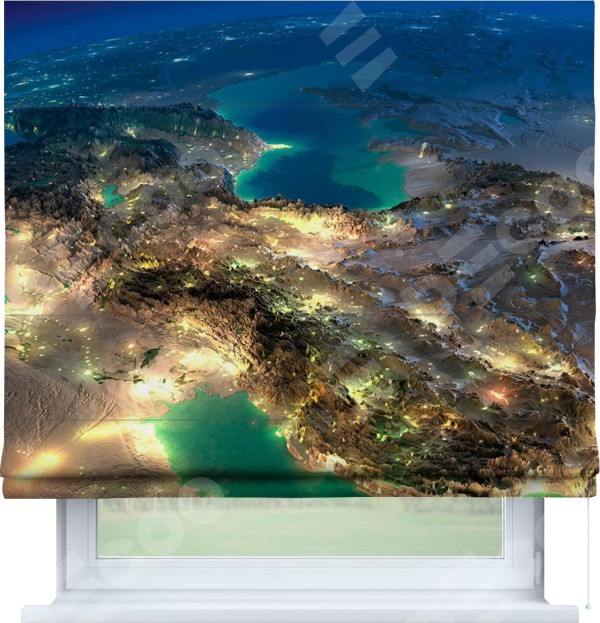 Римская штора производителя «Cortin», используется для проёма, пошита из ткани блэкаут с нанесением сублимационной печати «Ночные огни». Имеет универсальный механизм и подходит для монтажа: на потолок, на стену и в нишу.
