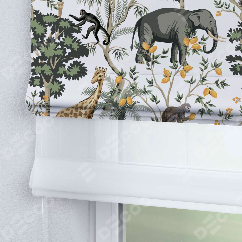 Римская штора день-ночь производителя «Cortin», используется для проёма, пошита из двух полотен, с лицевой блэкаут с нанесением сублимационной печати «Африканские равнины», вторая ткань тюль (по стандарту комплектуется тюль белого цвета артикул V-01). Имеет универсальный механизм и подходит для монтажа: на потолок, на стену и в нишу.