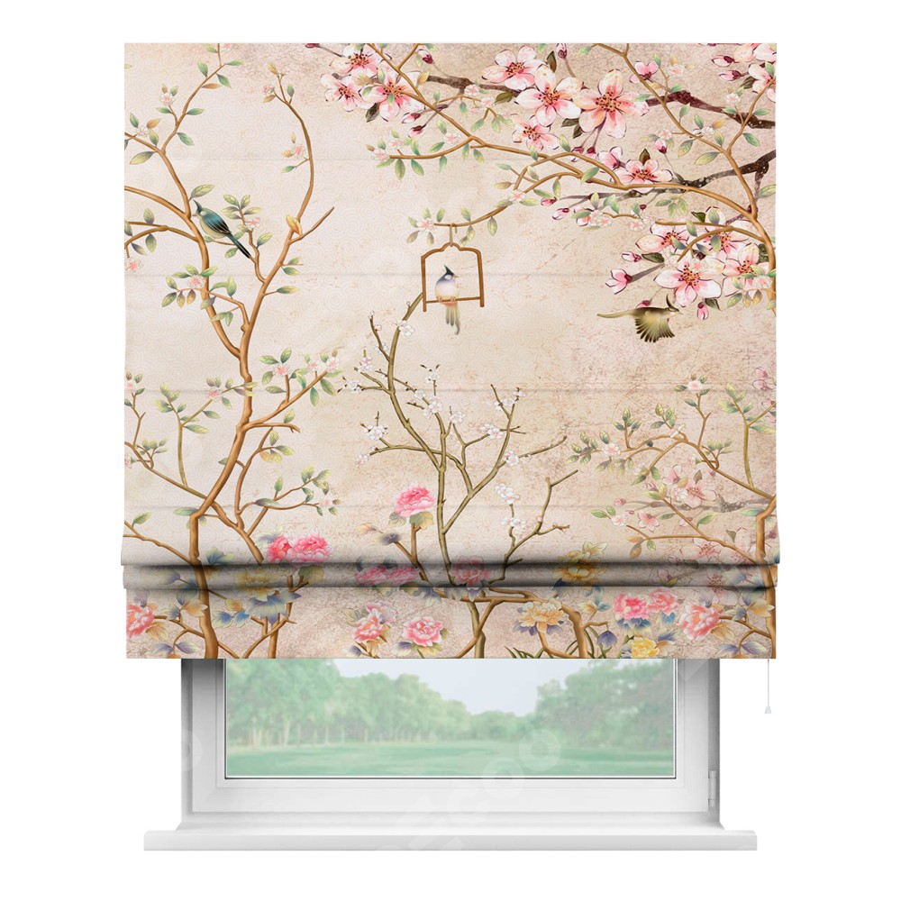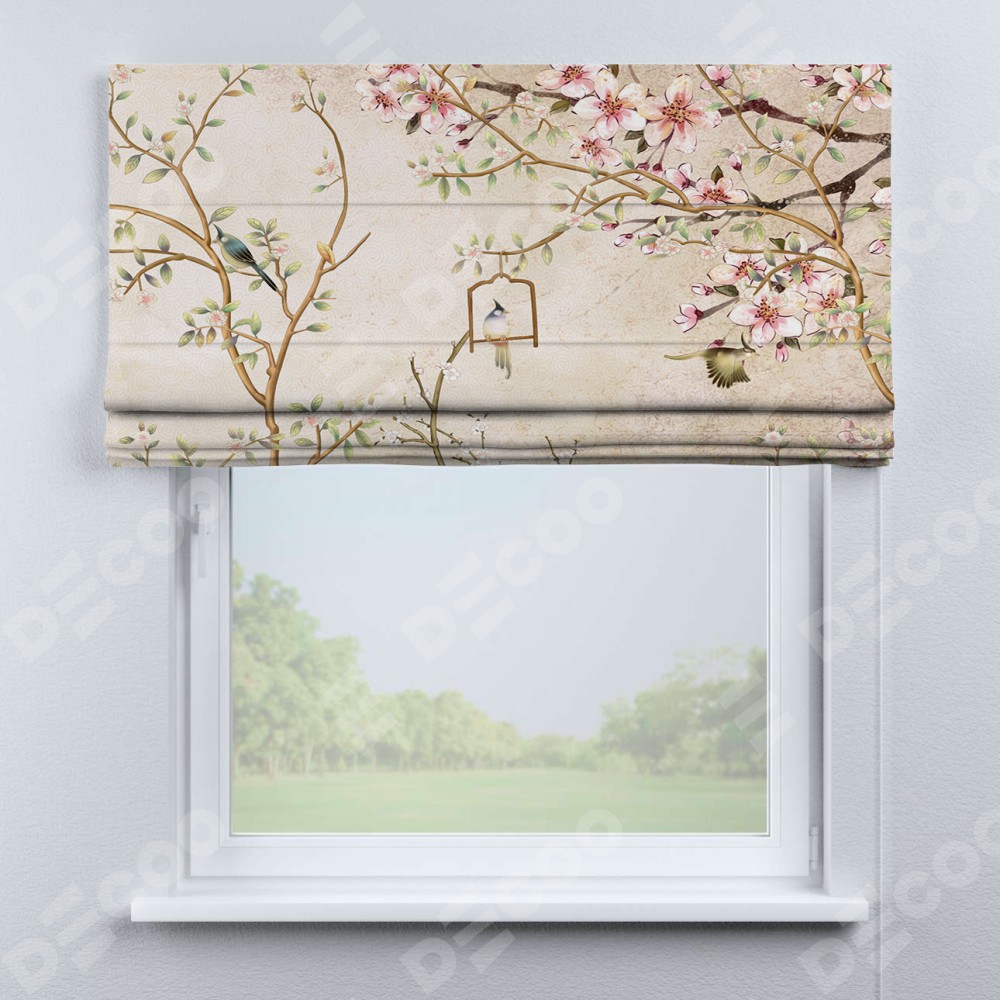 Римская штора производителя «Cortin», используется для проёма, пошита из ткани блэкаут с нанесением сублимационной печати «Весенний сад». Имеет универсальный механизм и подходит для монтажа: на потолок, на стену и в нишу.
