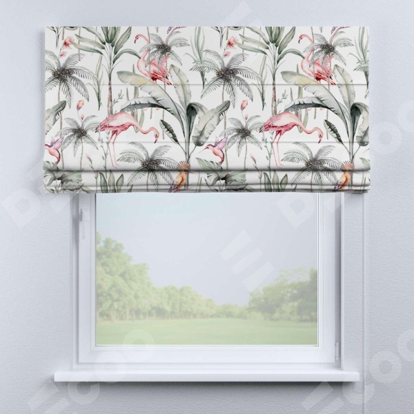 Римская штора производителя «Cortin», используется для проёма, пошита из ткани блэкаут с нанесением сублимационной печати «Изящные фламинго». Имеет универсальный механизм и подходит для монтажа: на потолок, на стену и в нишу.