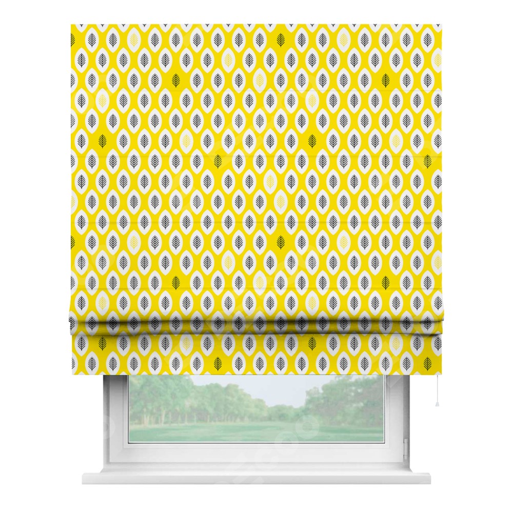 Римская штора производителя «Cortin», используется для проёма, пошита из ткани блэкаут с нанесением сублимационной печати «Солнечные листья». Имеет универсальный механизм и подходит для монтажа: на потолок, на стену и в нишу.