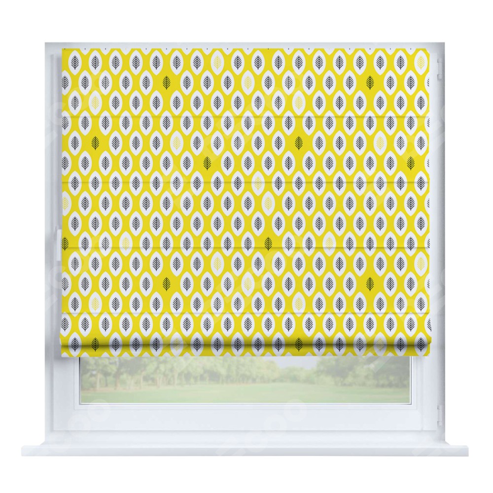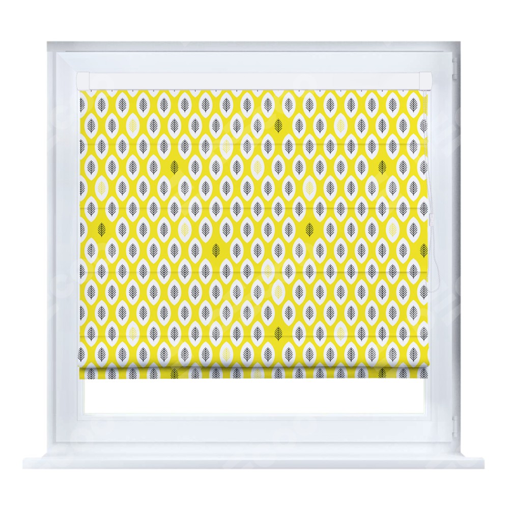 Римская штора производителя «Cortin», устанавливается на створку окна, пошита из ткани блэкаут с нанесением сублимационной печати «Солнечные листья». Штора шьётся по индивидуальным размерам, для данного типа римской шторы возможная ширина от 35 до 150 см., высота до 250 см.