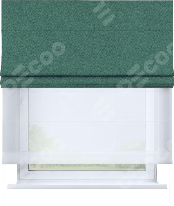 Римская штора день-ночь производителя «Cortin», используется для проёма, пошита из двух полотен, с лицевой стороны лён блэкаут бирюзовый артикул 69517, вторая ткань тюль (по стандарту комплектуется тюль белого цвета артикул V-01). Имеет универсальный механизм и подходит для монтажа: на потолок, на стену и в нишу.