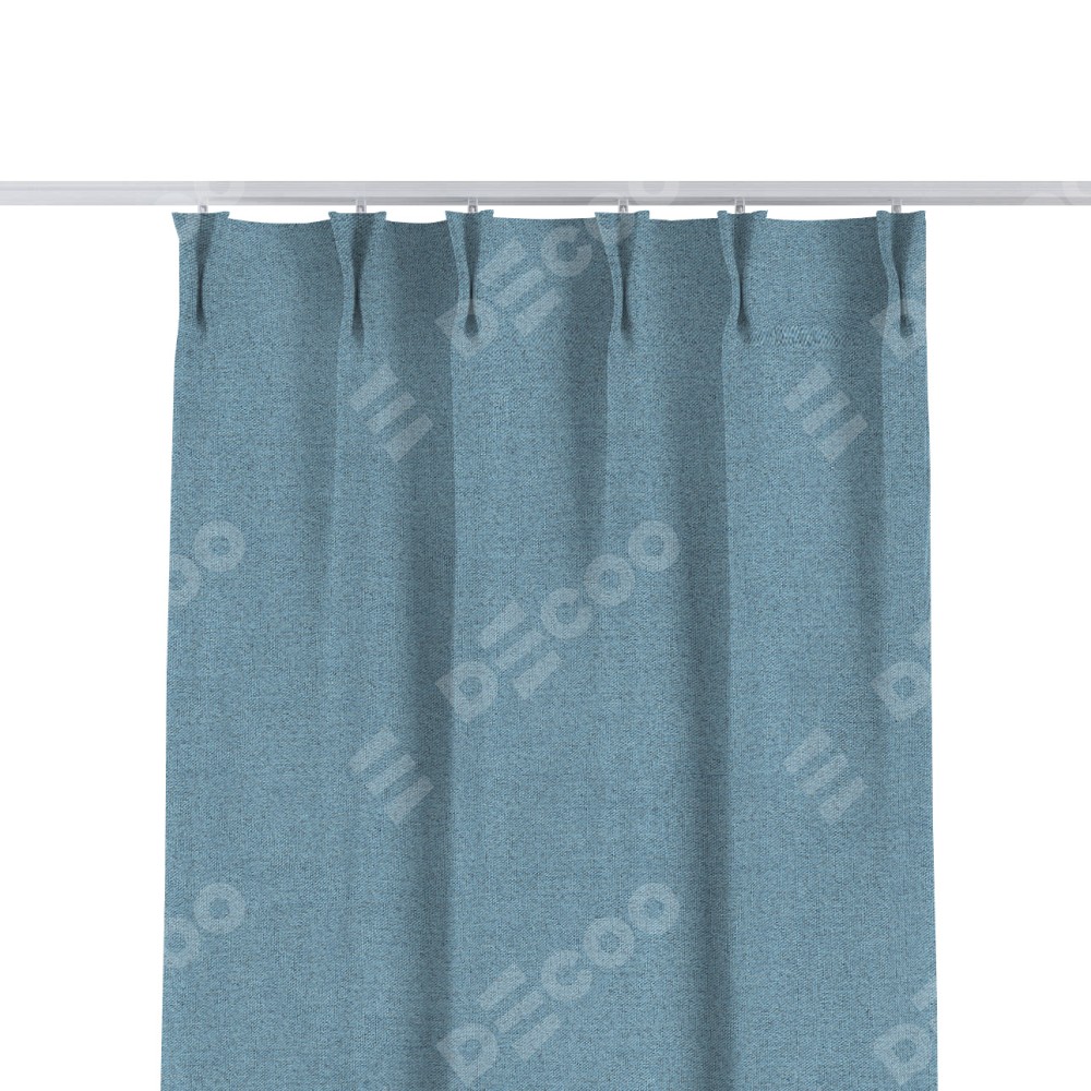 Комплект прямых штор, от производителя «Cortin», пошиты из ткани лён блэкаут голубой, артикул ткани 69574. С изнаночной стороны в верхней части штор пристрачивается шторная лента с декоративными складками «Кустик». Для создания элегантных складок прямые шторы шьются по стандарту с коэффициентом 1:2 (на 100 см. ширины проёма 200 см. ширины ткани).