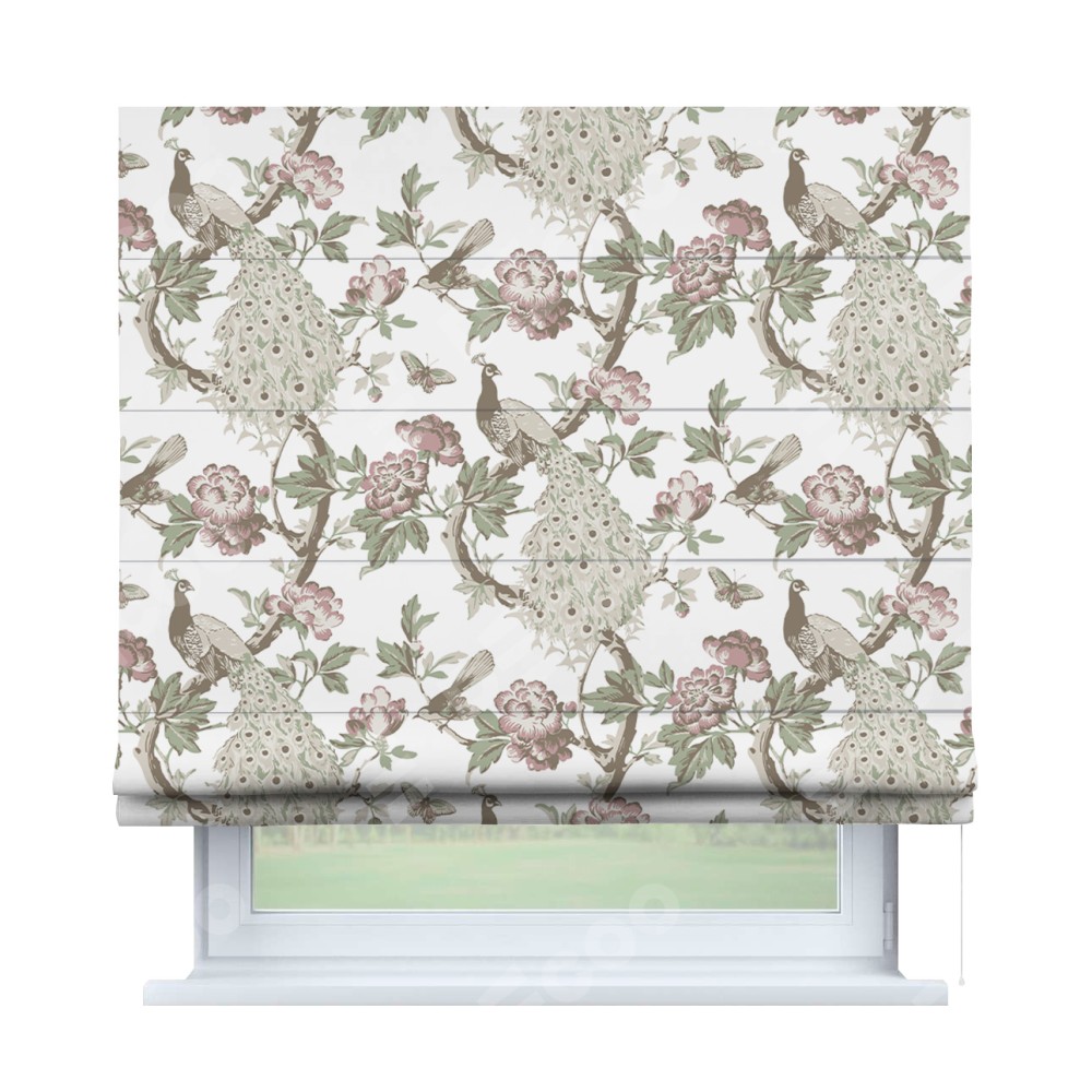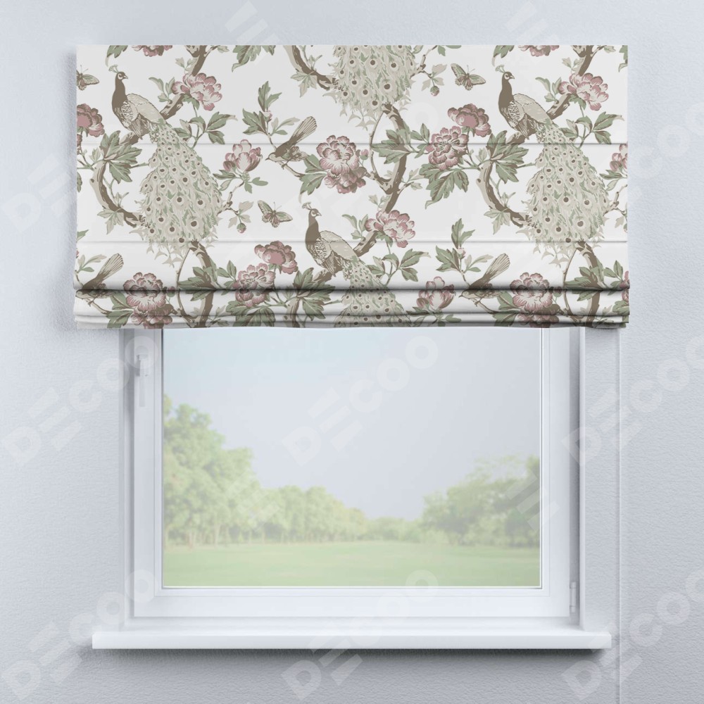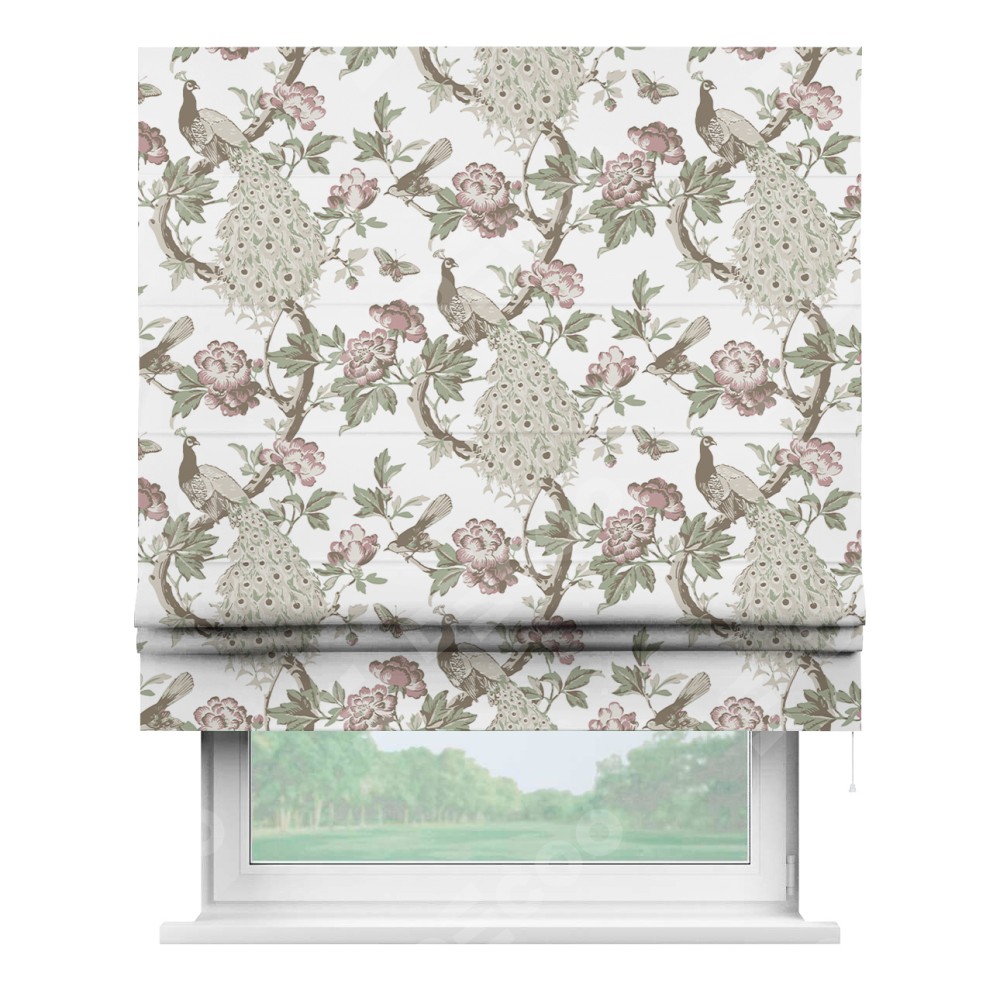 Римская штора производителя «Cortin», используется для проёма, пошита из ткани блэкаут с нанесением сублимационной печати «Гордые павлины». Имеет универсальный механизм и подходит для монтажа: на потолок, на стену и в нишу.