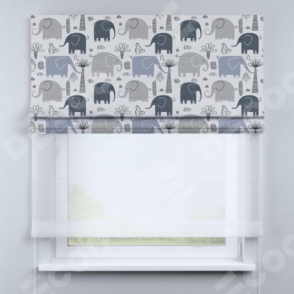 Римская штора день-ночь производителя «Cortin», используется для проёма, пошита из двух полотен, с лицевой блэкаут с нанесением сублимационной печати «Серые слоники», вторая ткань тюль (по стандарту комплектуется тюль белого цвета артикул V-01). Имеет универсальный механизм и подходит для монтажа: на потолок, на стену и в нишу.