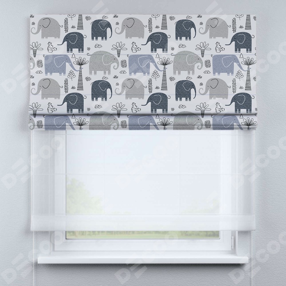 Римская штора день-ночь производителя «Cortin», используется для проёма, пошита из двух полотен, с лицевой блэкаут с нанесением сублимационной печати «Серые слоники», вторая ткань тюль (по стандарту комплектуется тюль белого цвета артикул V-01). Имеет универсальный механизм и подходит для монтажа: на потолок, на стену и в нишу.