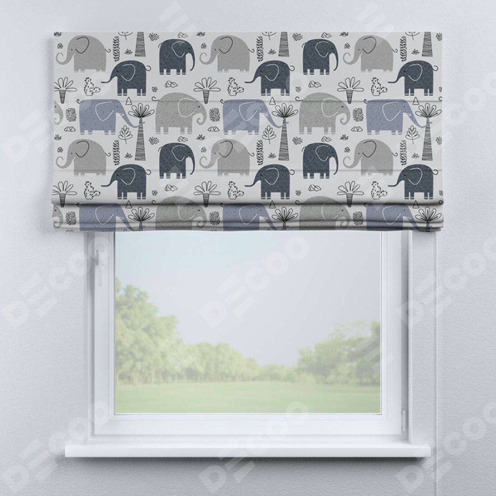 Римская штора производителя «Cortin», используется для проёма, пошита из ткани блэкаут с нанесением сублимационной печати «Серые слоники». Имеет универсальный механизм и подходит для монтажа: на потолок, на стену и в нишу.