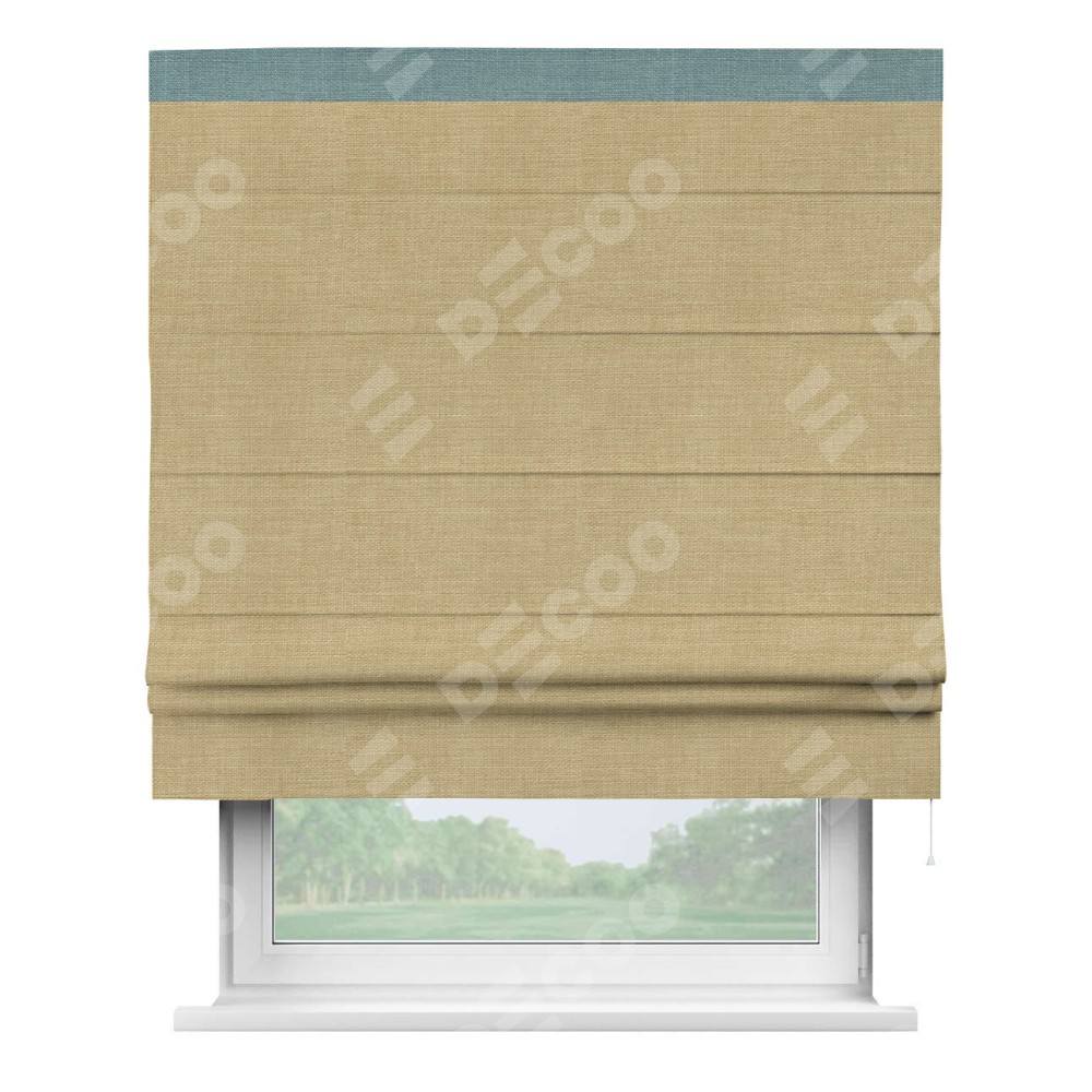 Римская штора производителя «Cortin», используется для проёма, пошита из ткани лён бежевый, артикул 7442. Отделка шторы кантом «Кинг», ткань для канта используется из льна разной расцветки на выбор. Имеет универсальный механизм и подходит для монтажа: на потолок, на стену и в нишу.