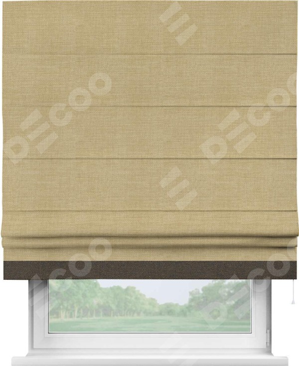 Римская штора производителя «Cortin», используется для проёма, пошита из ткани лён бежевый, артикул 7442. Отделка шторы кантом «Джестер», ткань для канта используется из льна разной расцветки на выбор. Имеет универсальный механизм и подходит для монтажа: на потолок, на стену и в нишу.