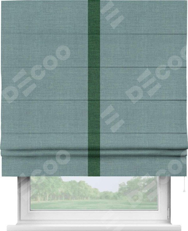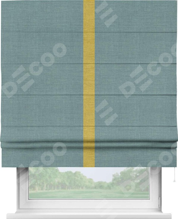 Римская штора производителя «Cortin», используется для проёма, пошита из ткани лён голубой, артикул 74736. Отделка шторы кантом «Хайвэй», ткань для канта используется из льна разной расцветки на выбор. Имеет универсальный механизм и подходит для монтажа: на потолок, на стену и в нишу.
