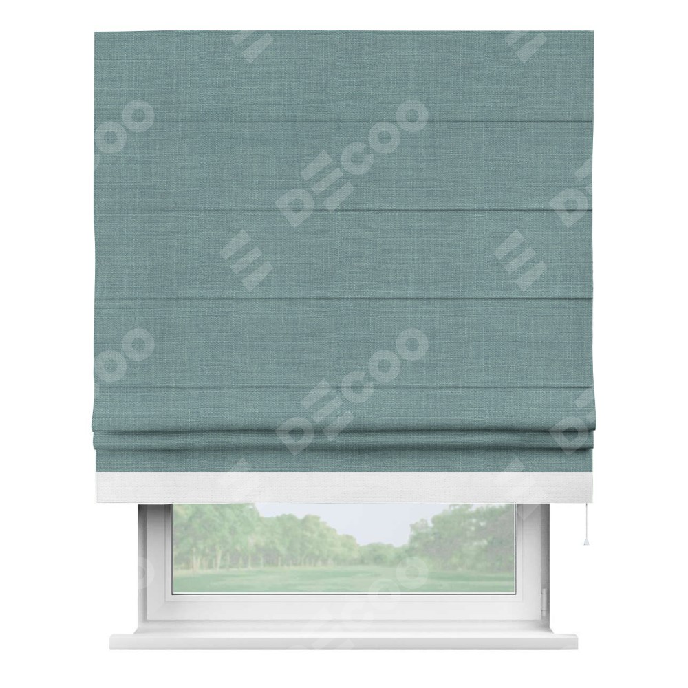 Римская штора производителя «Cortin», используется для проёма, пошита из ткани лён голубой, артикул 74736. Отделка шторы кантом «Джестер», ткань для канта используется из льна разной расцветки на выбор. Имеет универсальный механизм и подходит для монтажа: на потолок, на стену и в нишу.