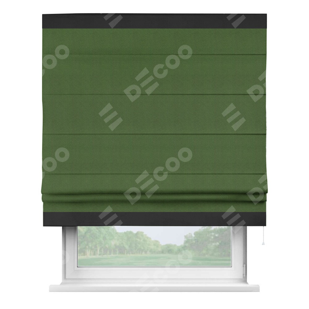 Римская штора производителя «Cortin», используется для проёма, пошита из ткани блэкаут однотонный зелёный перламутр, артикул ткани 81859−2. Отделка шторы кантом «Горизонт», ткань для канта используется из блэкаута однотонного разной расцветки на выбор. Имеет универсальный механизм и подходит для монтажа: на потолок, на стену и в нишу.