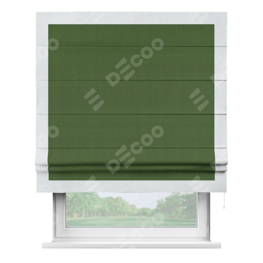 Римская штора производителя «Cortin», используется для проёма, пошита из ткани блэкаут однотонный зелёный перламутр, артикул ткани 81859−2. Отделка шторы кантом «Чесс», ткань для канта используется из блэкаута однотонного разной расцветки на выбор. Имеет универсальный механизм и подходит для монтажа: на потолок, на стену и в нишу.