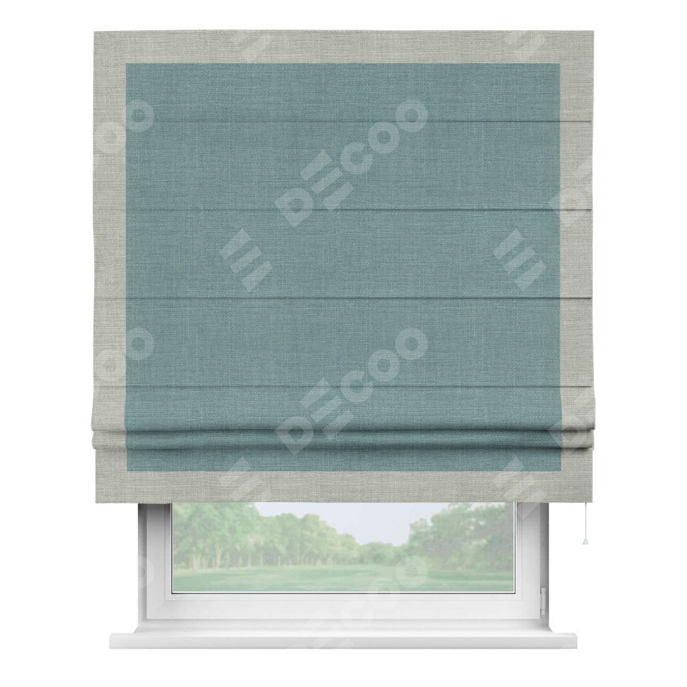 Римская штора производителя «Cortin», используется для проёма, пошита из ткани лён голубой, артикул 74736. Отделка шторы кантом «Чесс», ткань для канта используется из льна разной расцветки на выбор. Имеет универсальный механизм и подходит для монтажа: на потолок, на стену и в нишу.