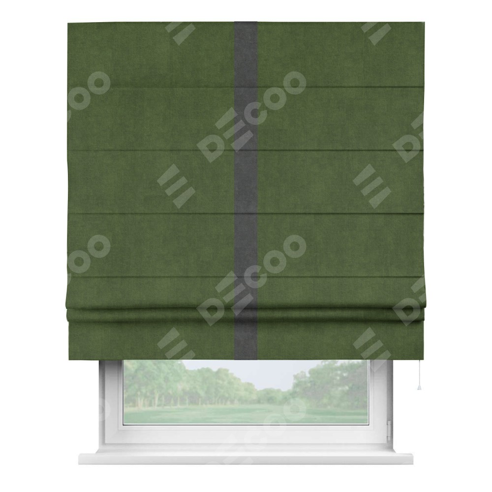 Римская штора производителя «Cortin», используется для проёма, пошита из ткани вельвет тёмно-салатовый, артикул ткани 33805. Отделка шторы кантом «Хайвей», ткань для канта используется из вельвета разной расцветки на выбор. Имеет универсальный механизм и подходит для монтажа: на потолок, на стену и в нишу.