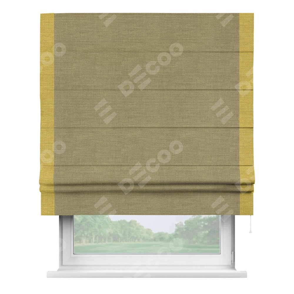 Римская штора производителя «Cortin», используется для проёма, пошита из ткани лён коричневый, артикул 7443. Отделка шторы кантом «Стрим Дуо», ткань для канта используется из льна разной расцветки на выбор. Имеет универсальный механизм и подходит для монтажа: на потолок, на стену и в нишу.