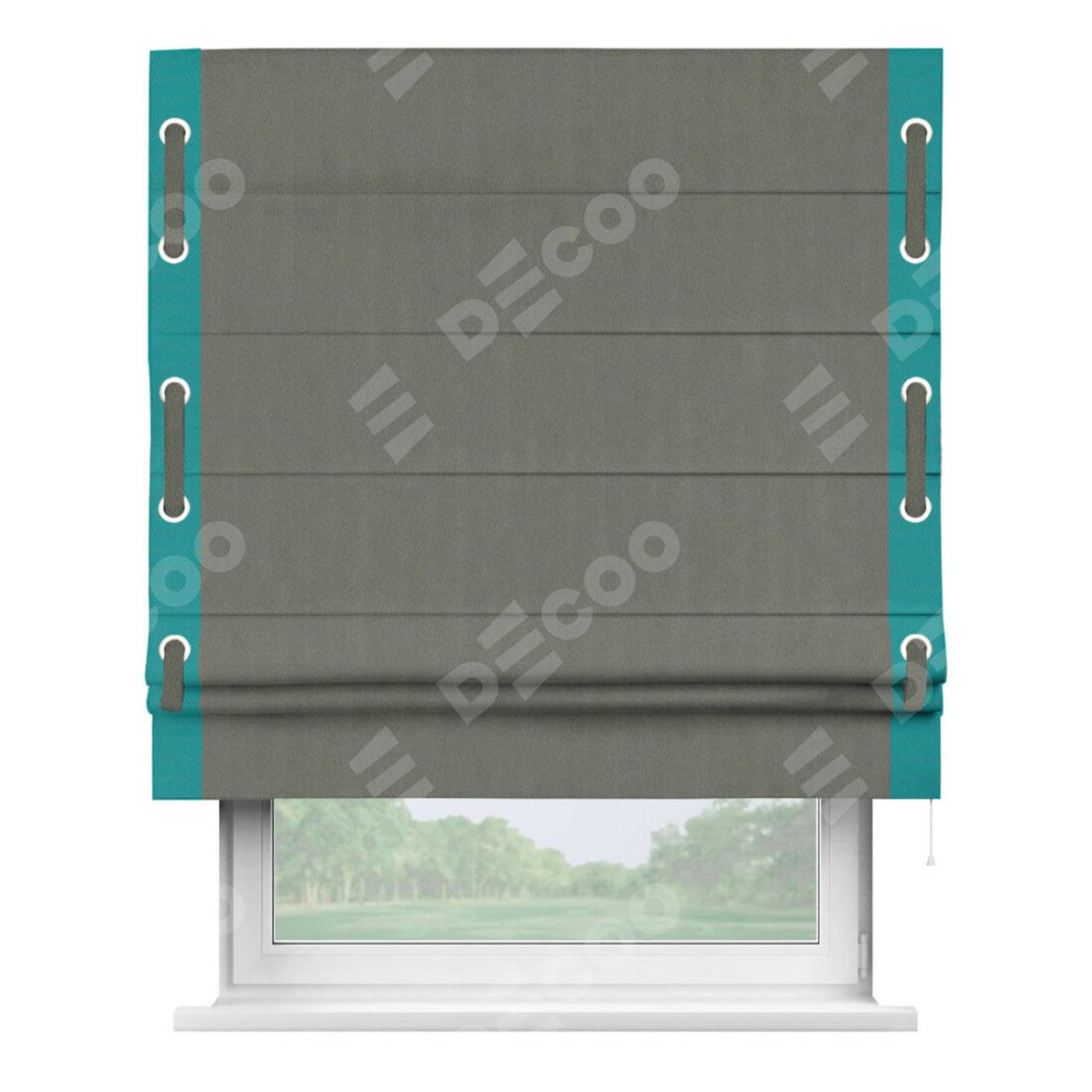 Римская штора производителя «Cortin», используется для проёма, пошита из ткани блэкаут однотонный тёмно-серый, артикул ткани 29332−1. Отделка шторы кантом «Стрим Дуо» на кантах расположены люверсы с пояском, ткань для канта используется из блэкаута однотонного разной расцветки на выбор. Ткань для пояска обычно используется из основной ткани шторы, а так же можно сделать из любой расцветки по желанию. Имеет универсальный механизм и подходит для монтажа: на потолок, на стену и в нишу.