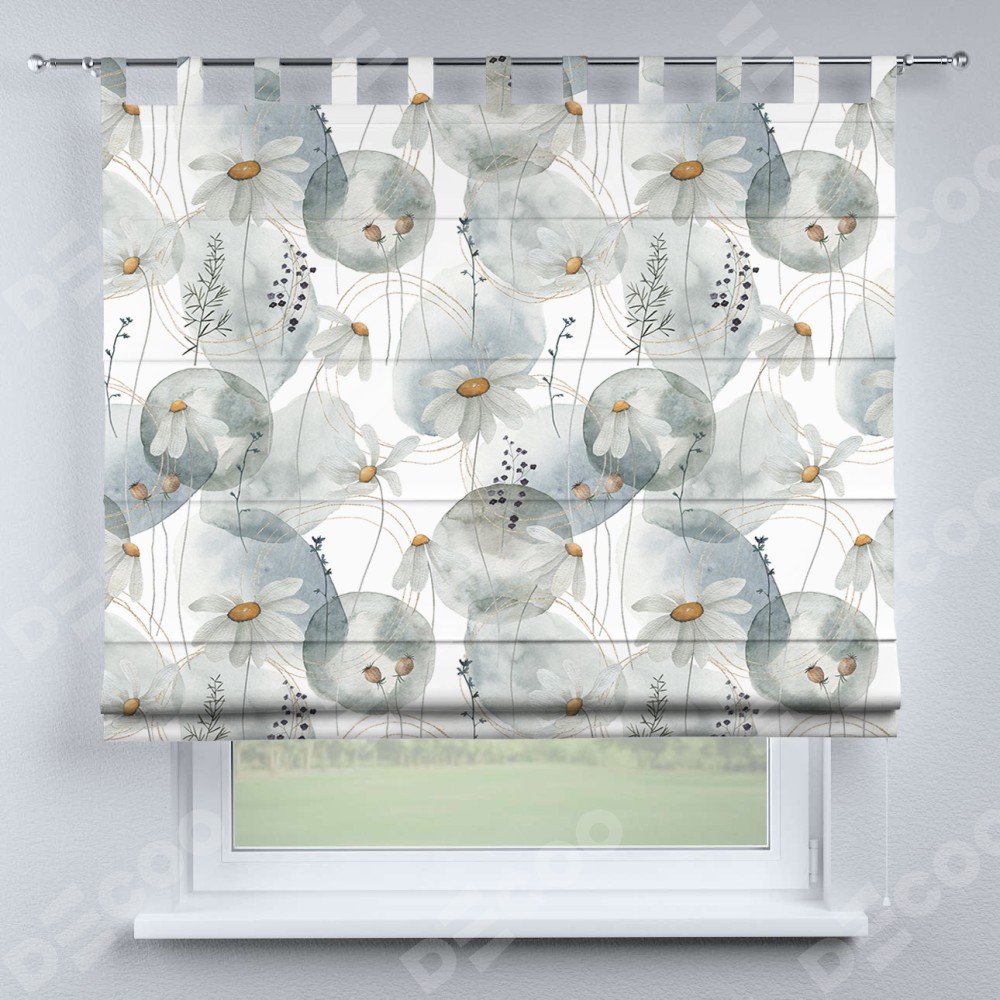 Римская штора производителя «Cortin», используется для проёма, пошита из ткани блэкаут с нанесением сублимационной печати «Ромашки акварель». Данная модель пошита на петлях, комплектуется на выбор круглым карнизом и подходит для монтажа на стену. Римская штора на петлях имеет простую систему регулировки высоты, отличительным преимуществом данной модели является простой способ монтажа. Достаточно повесить ее на трубу и штора готова!