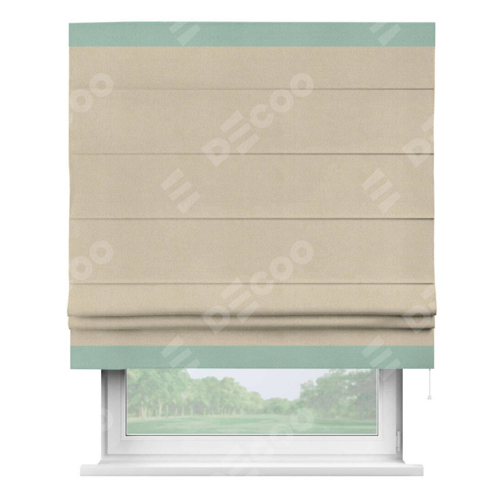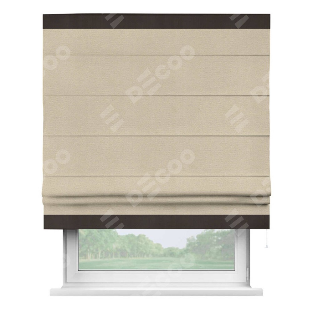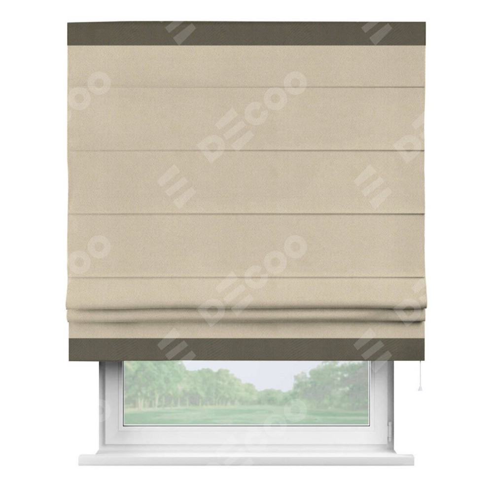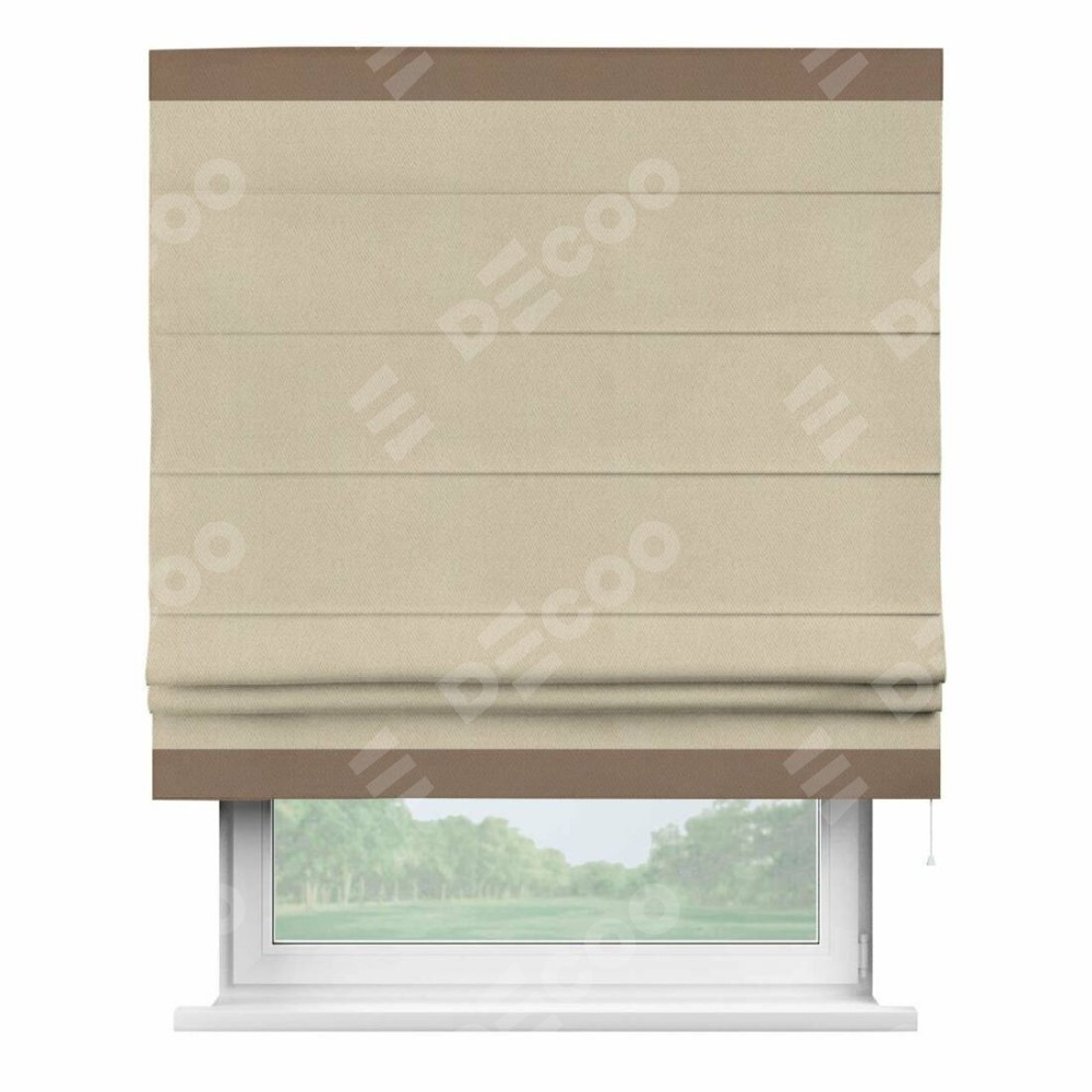 Римская штора производителя «Cortin», используется для проёма, пошита из ткани блэкаут однотонный кофейно-бежевый, артикул ткани 12095−1. Отделка шторы кантом «Горизонт», ткань для канта используется из блэкаута однотонного разной расцветки на выбор. Имеет универсальный механизм и подходит для монтажа: на потолок, на стену и в нишу.