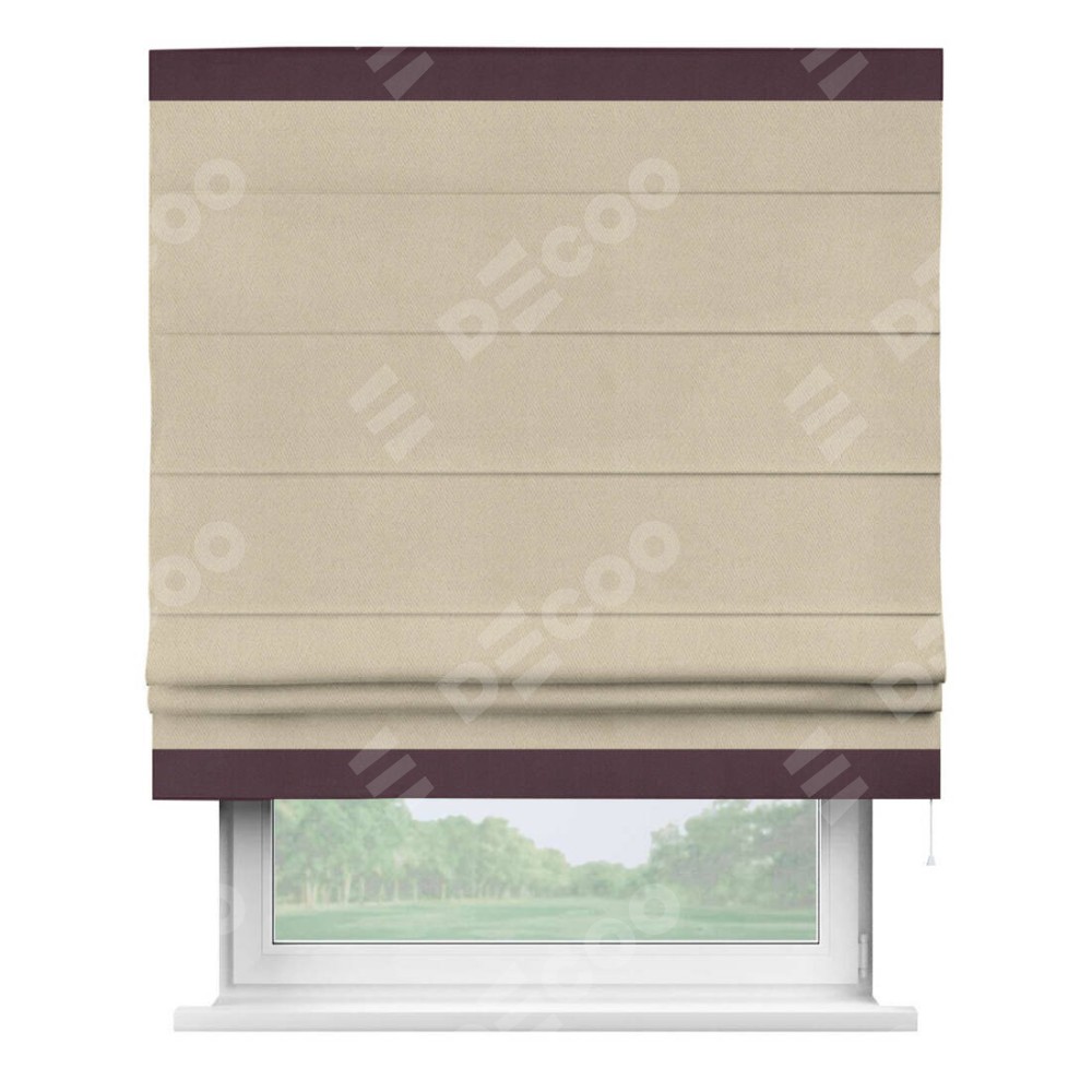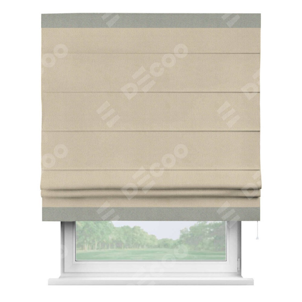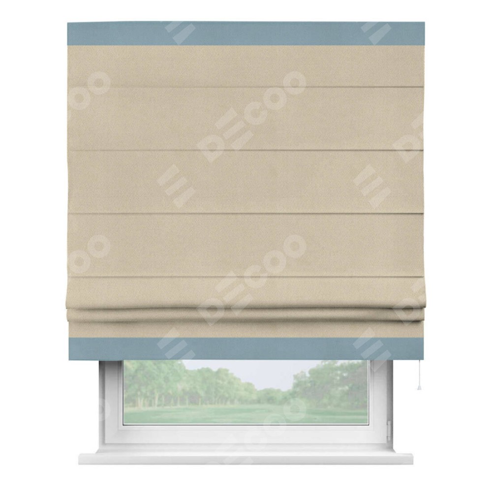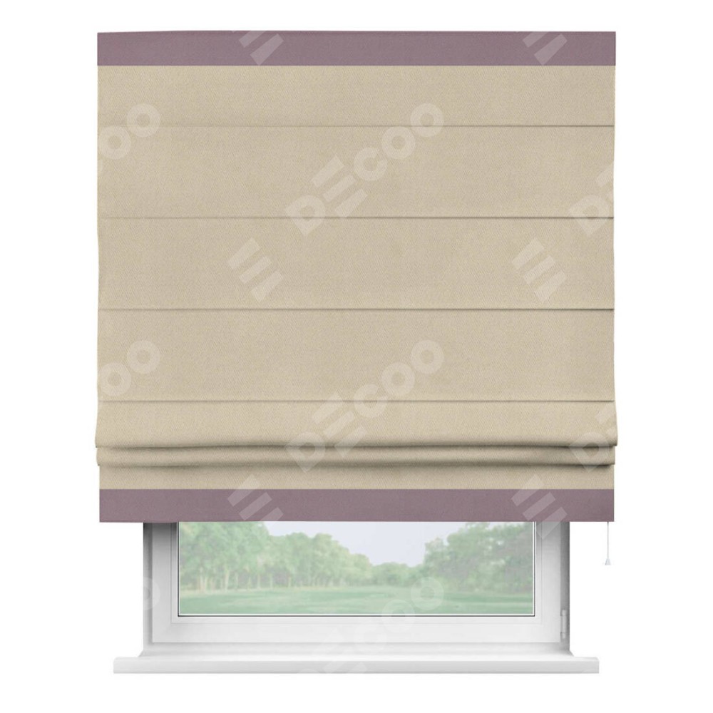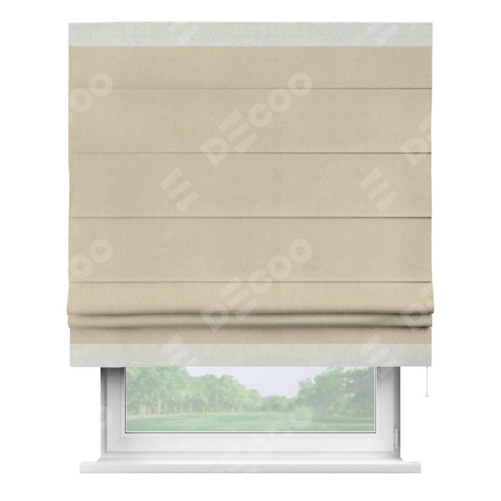Римская штора производителя «Cortin», используется для проёма, пошита из ткани блэкаут однотонный кофейно-бежевый, артикул ткани 12095−1. Отделка шторы кантом «Горизонт», ткань для канта используется из блэкаута однотонного разной расцветки на выбор. Имеет универсальный механизм и подходит для монтажа: на потолок, на стену и в нишу.