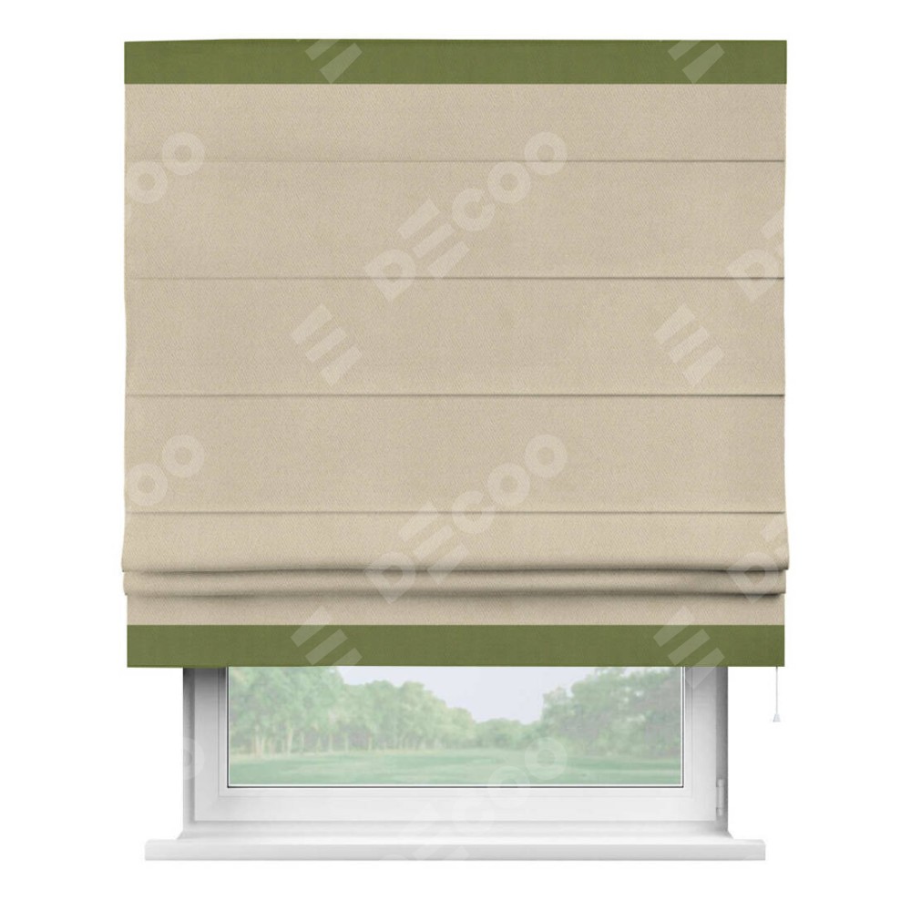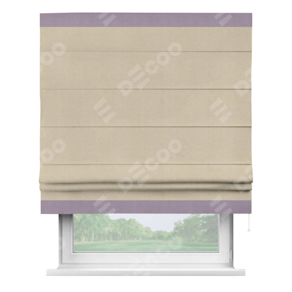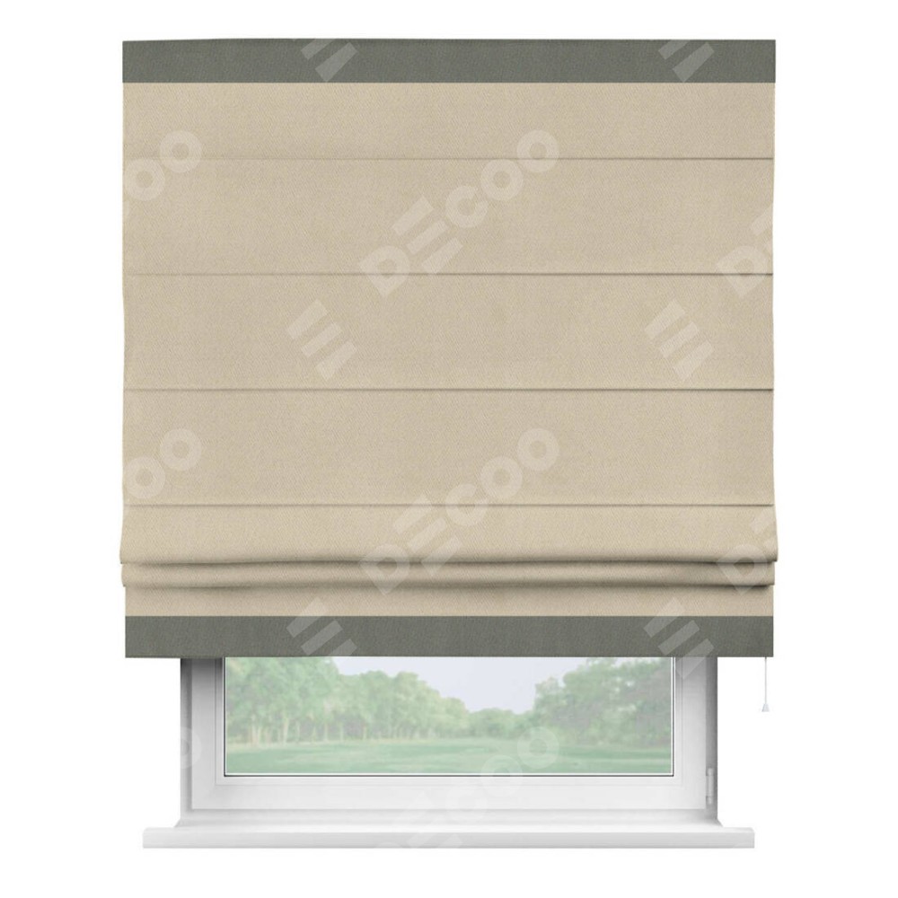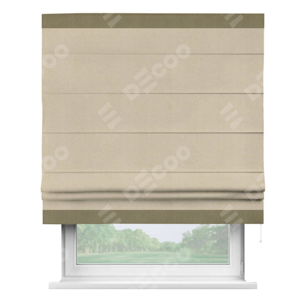 Римская штора производителя «Cortin», используется для проёма, пошита из ткани блэкаут однотонный кофейно-бежевый, артикул ткани 12095−1. Отделка шторы кантом «Горизонт», ткань для канта используется из блэкаута однотонного разной расцветки на выбор. Имеет универсальный механизм и подходит для монтажа: на потолок, на стену и в нишу.